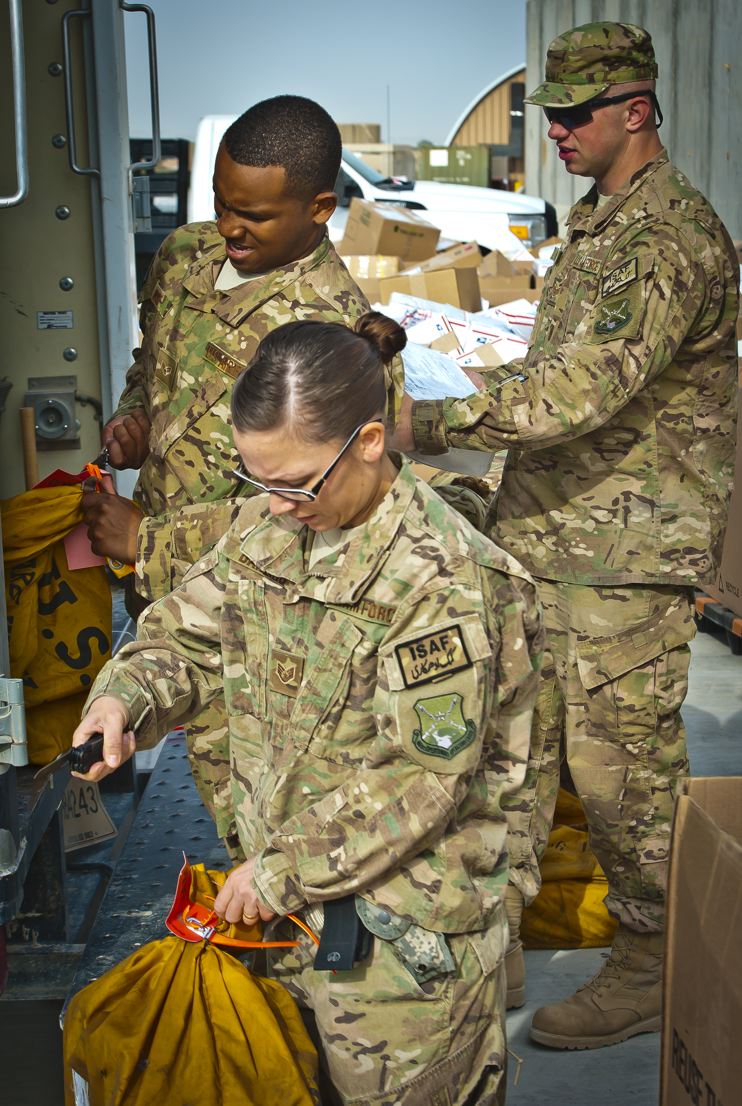 U.S. Air Force Senior Airman Ken Wise, 451st Air Expeditionary Wing mail custodian, tosses a package to U.S. Air Force Staff Sgt. Hollie Darling, 361st Expeditionary Reconnaissance Squadron and mail crew volunteer, at Kandahar Airfield, Afghanistan, May 10, 2013. Darling is one of many volunteers from different squadrons within the wing that help gather, sort and distribute mail. The mail crew handles about 50,000 pounds of mail weekly. (U.S. Air Force/photo Senior Airman Scott Saldukas)
