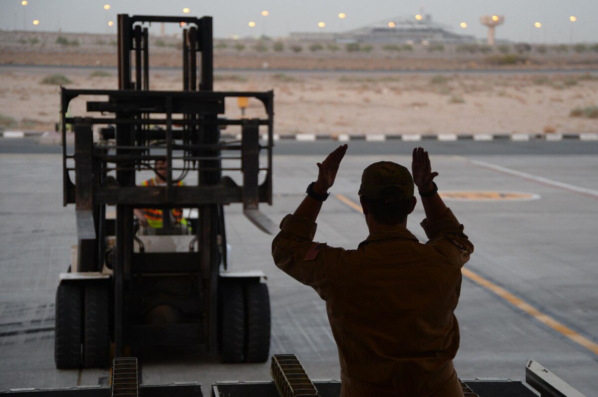 U.S. Air Force Senior Airman Garth, discuss an unload plan with Senior Airman Rebecca, 816th Expeditionary Airlift Squadron loadmaster, during a cargo delivery in support of Operation Inherent Resolve on a C-17 Globemaster III in Southwest Asia, August 14, 2015. OIR is the military intervention against Daesh. (U.S. Air Force photo by Staff Sgt. Sandra Welch)