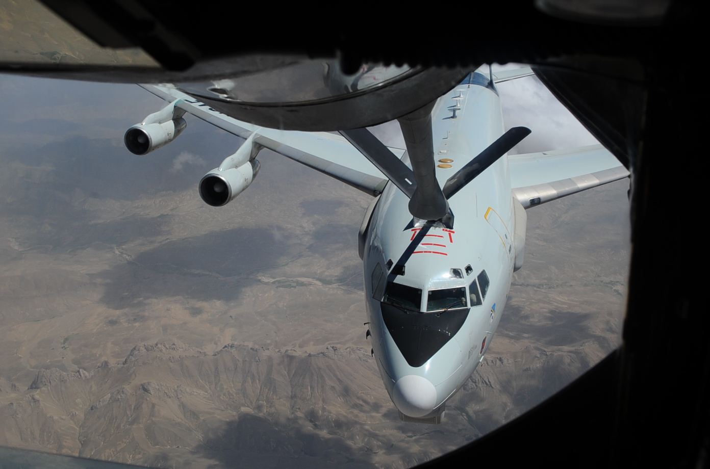 An E-3 Sentry receives fuel from a 340th Expeditionary Air Refueling Squadron KC-135 Stratotanker while flying over Afghanistan May 25, 2010. (U.S. Air Force photo by Senior Airman Kasey Zickmund)[RELEASED]