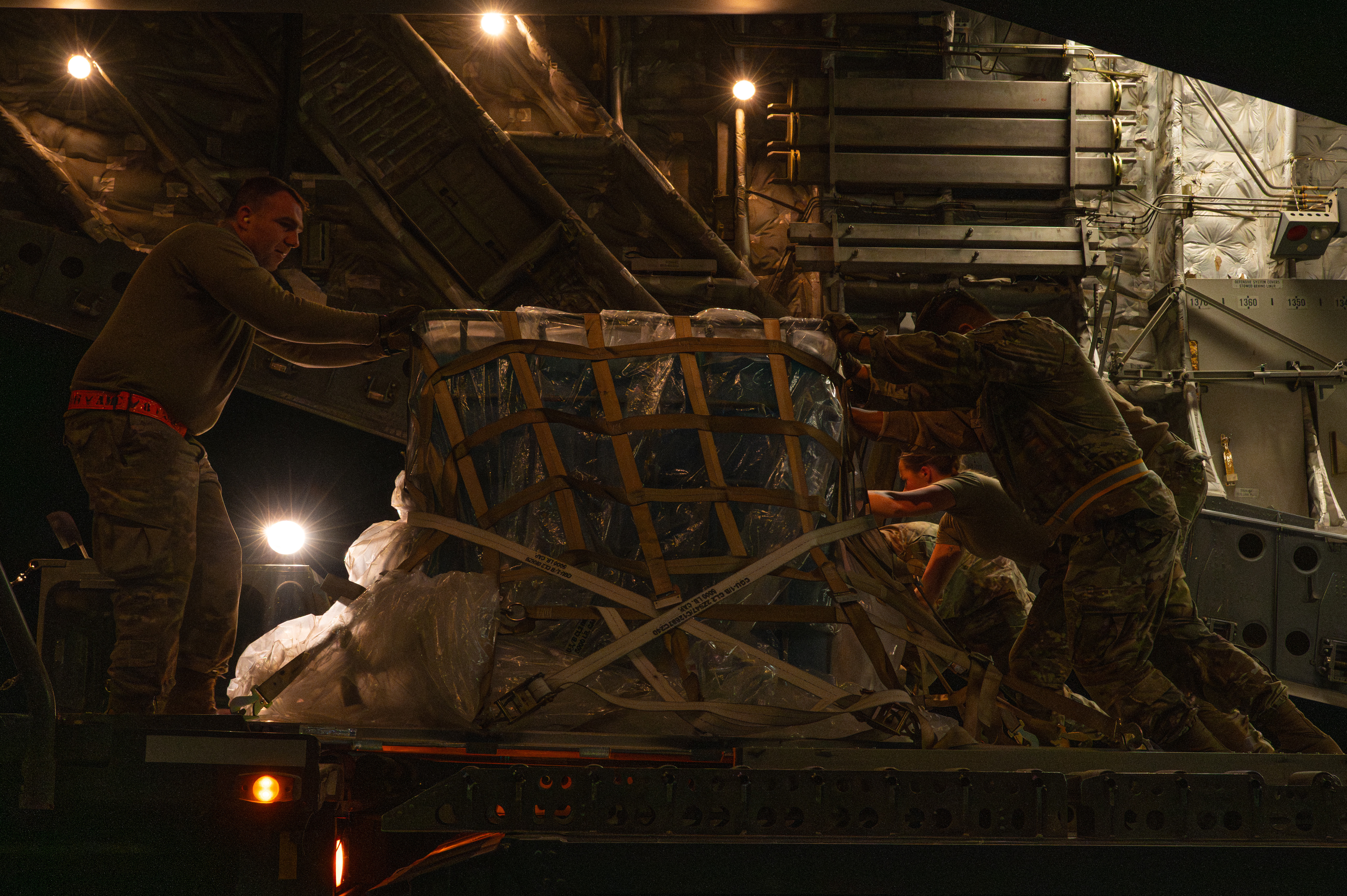 U.S. Airmen assigned to the 379th Expeditionary Aerial Port Squadron load cargo onto a C-17 Globemaster III aircraft in support of a readiness exercise within the U.S. Central Command area of responsibility, Jan. 21, 2026. The exercise spanned across the CENTCOM AOR, elevating readiness with realistic scenarios that tested dispersed operations, rapid deployment of aircraft, and positive control over a large area. (U.S. Air Force photo by Senior Airman Joseph Garcia)