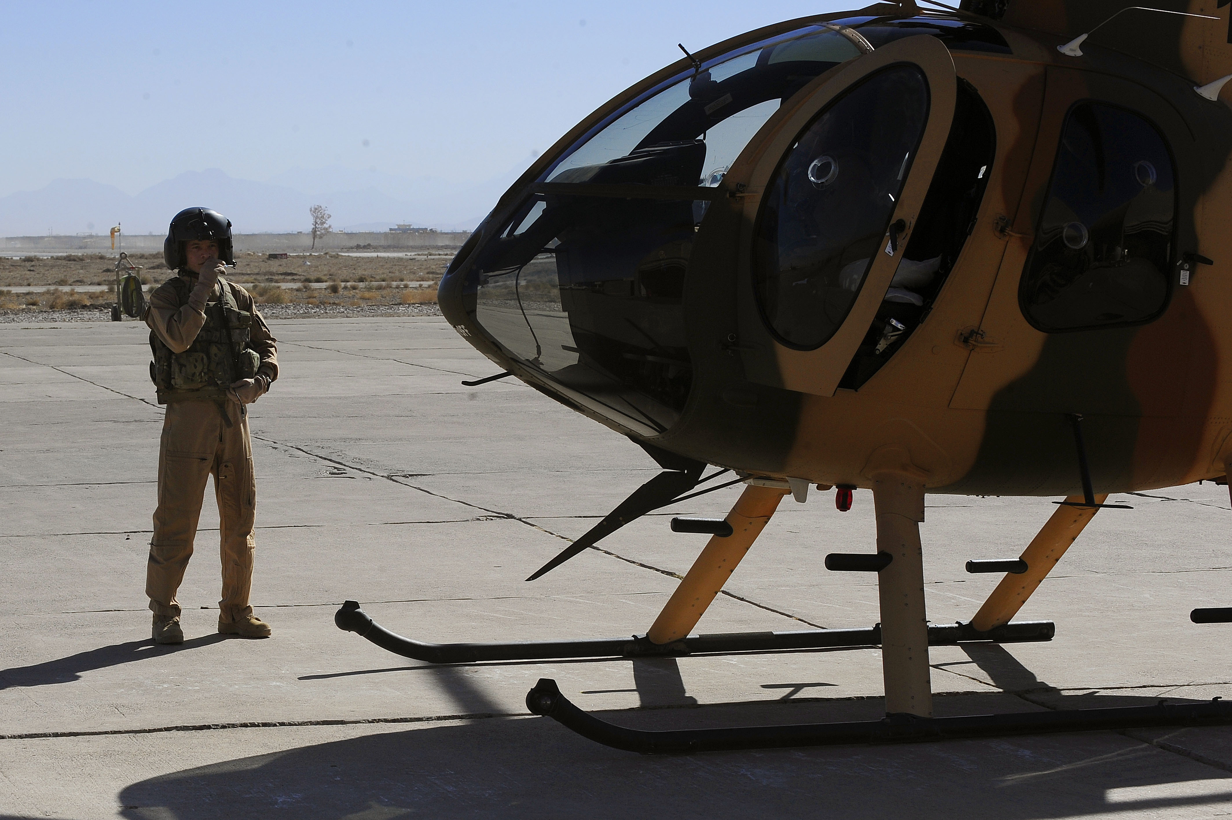 Afghan Air Force student pilot Lt. Mohammed Wares Alavi checks his sector before takeoff during his first solo flight in an MD-530 helicopter, Oct. 16, 2012, at Shindand Air Base, Afghanistan. Alavi was one of three pilots to solo in the MD-530 that day; the pilots flew 50 hours with an instructor before their solo flights. (U.S. Air Force photo/ Tech. Sgt. Quinton Russ/RELEASED)