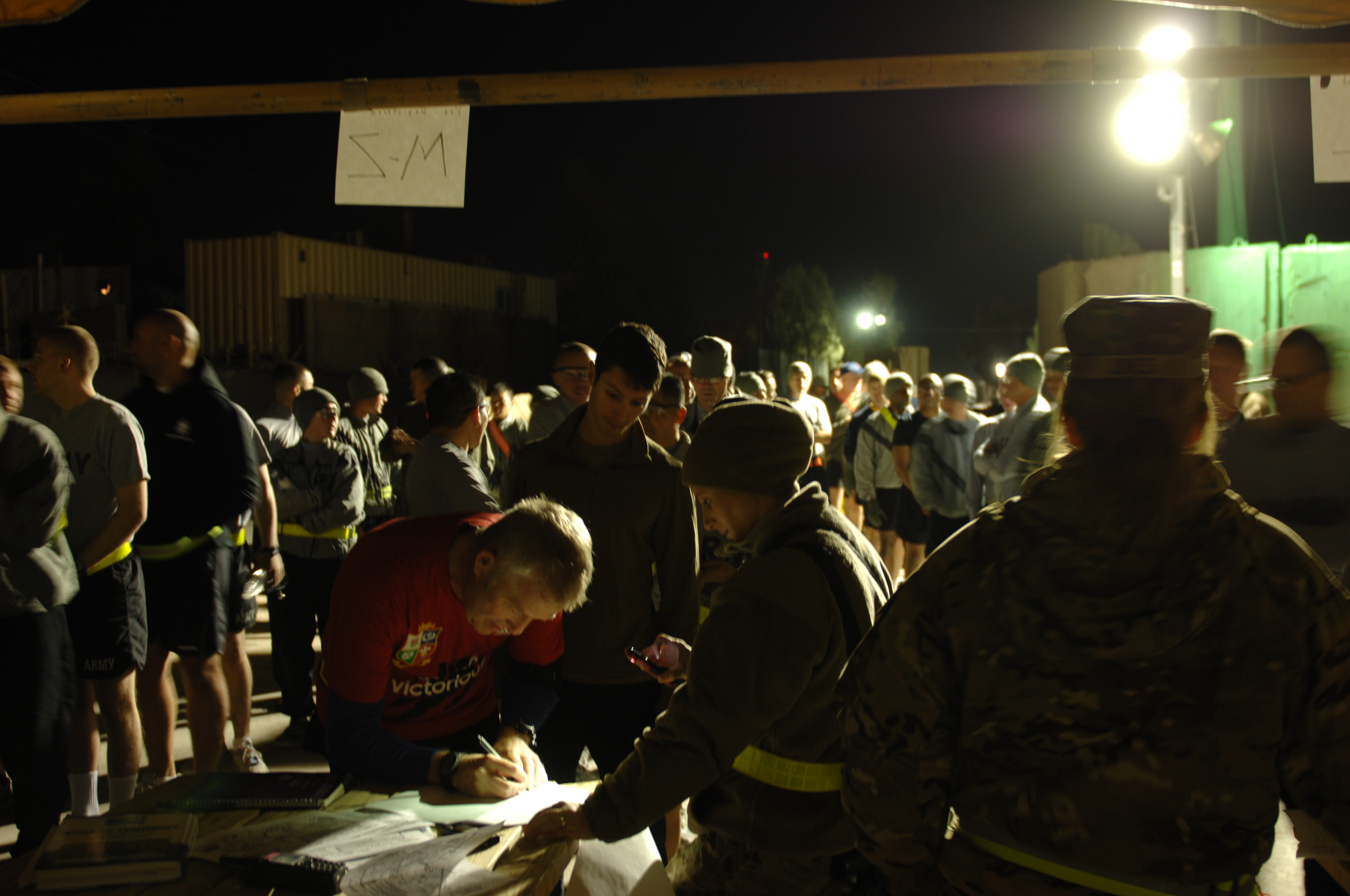 Participants line up early Nov. 1, 2013, to sign up for the Tulsa Run Afghanistan at Kandahar Airfield, Afghanistan. Registration for the 15-kilometer run started at 5:30 a.m. (U.S. Air Force photo by Senior Airman Jack Sanders)