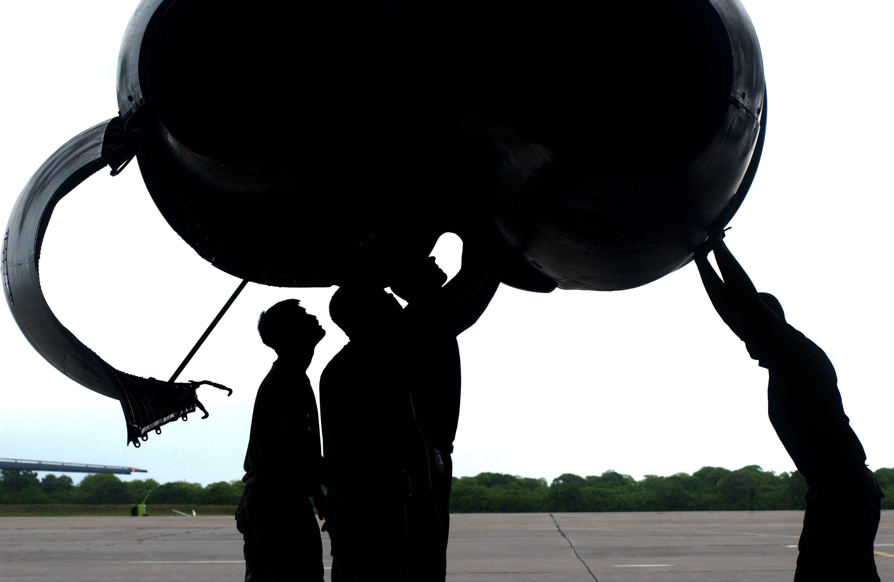 OPERATION ENDURING FREEDOM -- B-52H Stratofortress crew chiefs from the 28th Air Expeditionary Wing lock in place the number six engine cover at an operating location in support of Operation Enduring Freedom. Coalition forces flew 157 sorties into Afghanistan on Dec. 9. (U.S. Air Force photo by Tech. Sgt. Cedric H. Rudisill)