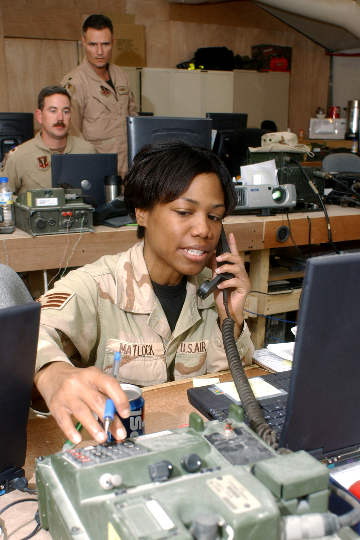 OPERATION IRAQI FREEDOM -- Staff Sgt. Selena Matlock tracks aircraft take off and landing times at the Coalition Operations Center, ensuring Air Tasking Orders are updated. In the background, Lt. Col. Joseph Justice (standing) and Maj. David Wright, Coalition Operations Center directors, coordinate the flying schedule. All are assigned to the 379th Air Expeditionary Wing at a deployed location. (U.S. Air Force photo by Master Sgt. Terry Blevins)