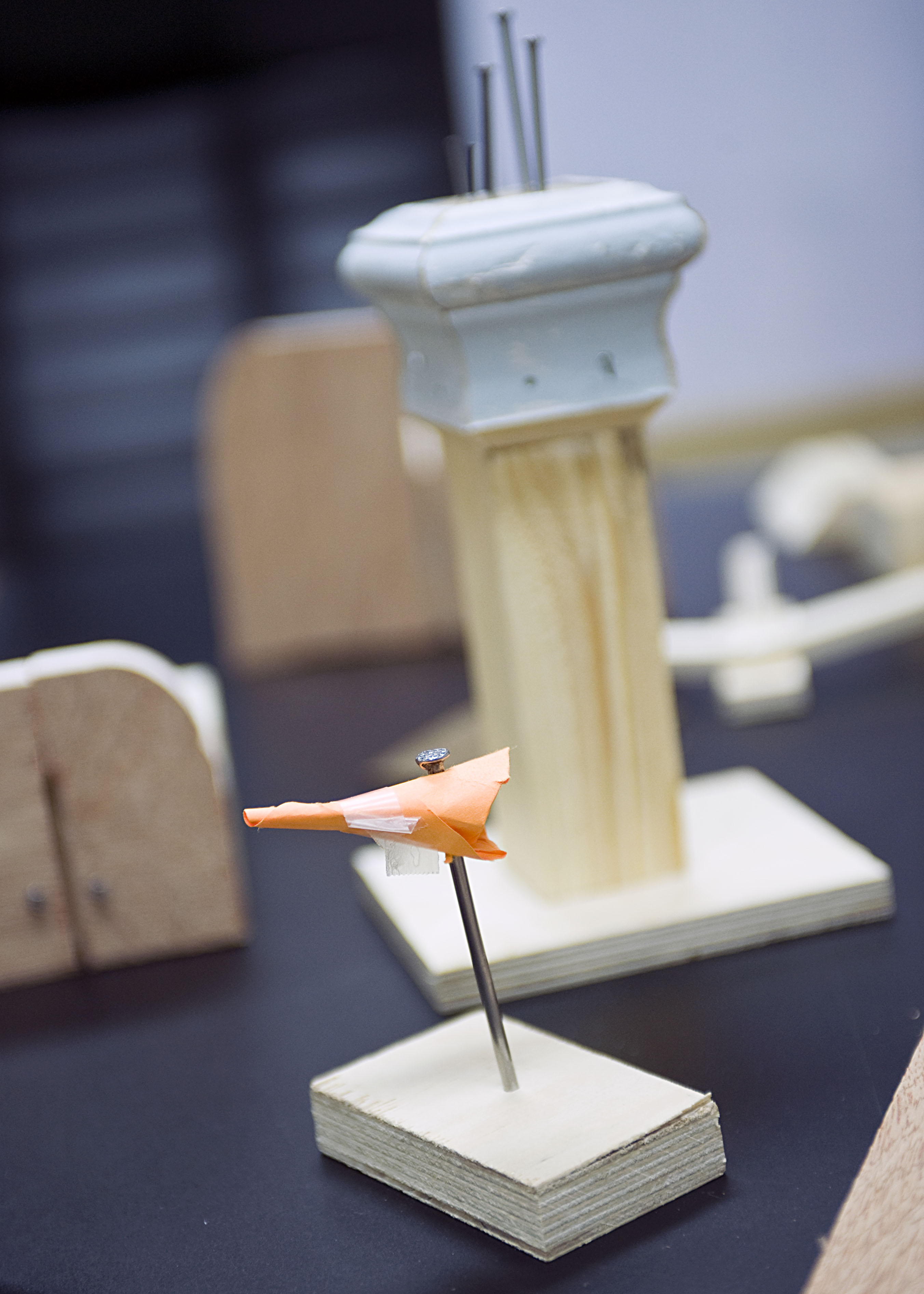 A simulated windsock and control tower are used as visual aids during the Koi Tosh language exchange at the Transit Center at Manas, Kyrgyzstan, Nov. 28, 2012. Visual and tactile learning aids assisted with bridging the language barrier between Transit Center personnel and Kyrgyz Republic pilots.