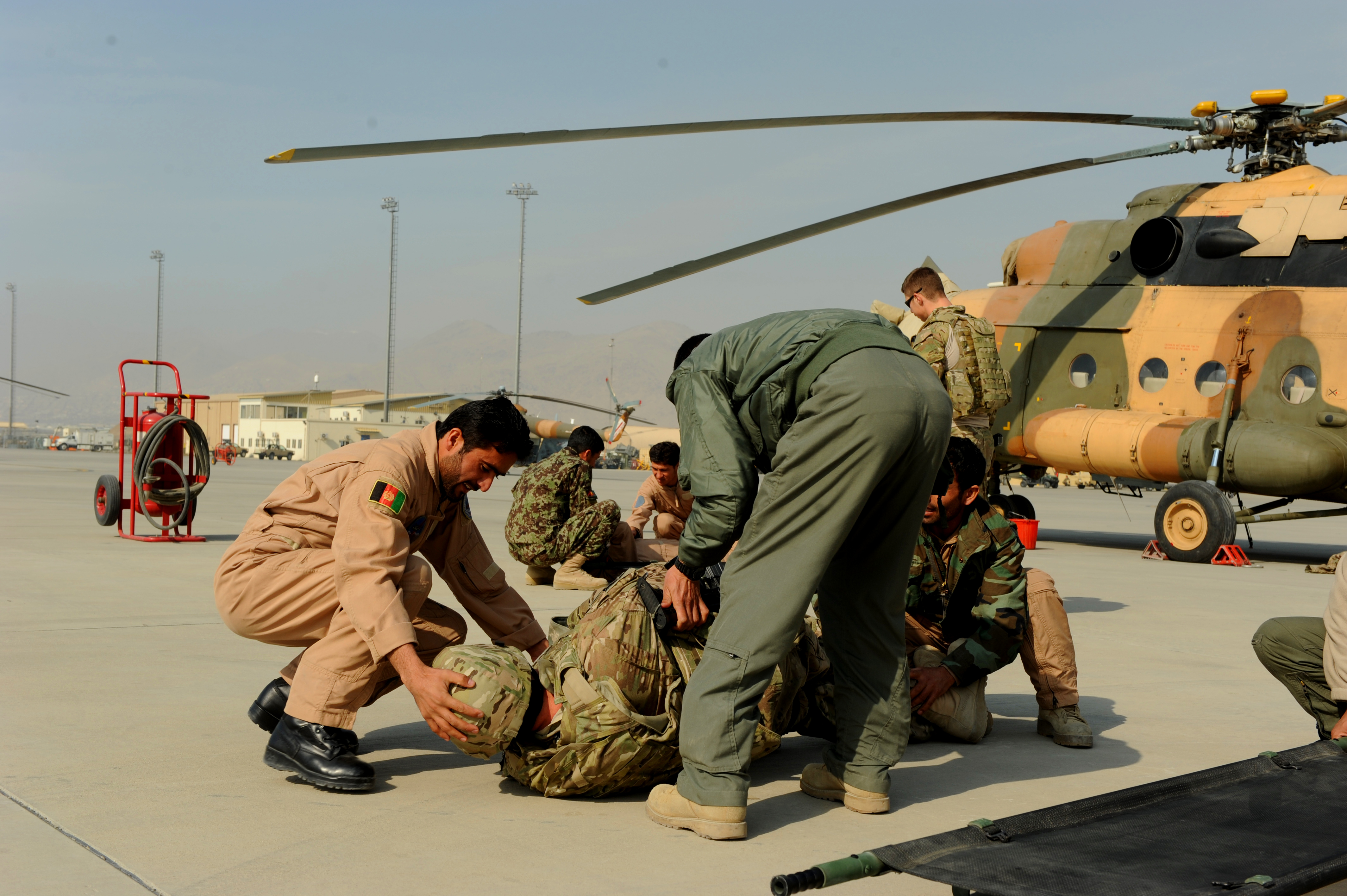 In a simulation, Afghan Air Force aircrew members practice moving patients to a litter so they can properly load them onto a Mi-17 for an air transfer Nov. 20, 2012 at the Kabul, Afghanistan, International Airport. Students had three days of training to learn such skills as proper patient loading and unloading techniques on Mi-17 and Mi-35 helicopters, and classroom and hands-on training for tourniquet, sling and bandage application.(U.S. Air Force photo/Staff Sgt. Melissa K. Mekpongsatorn)