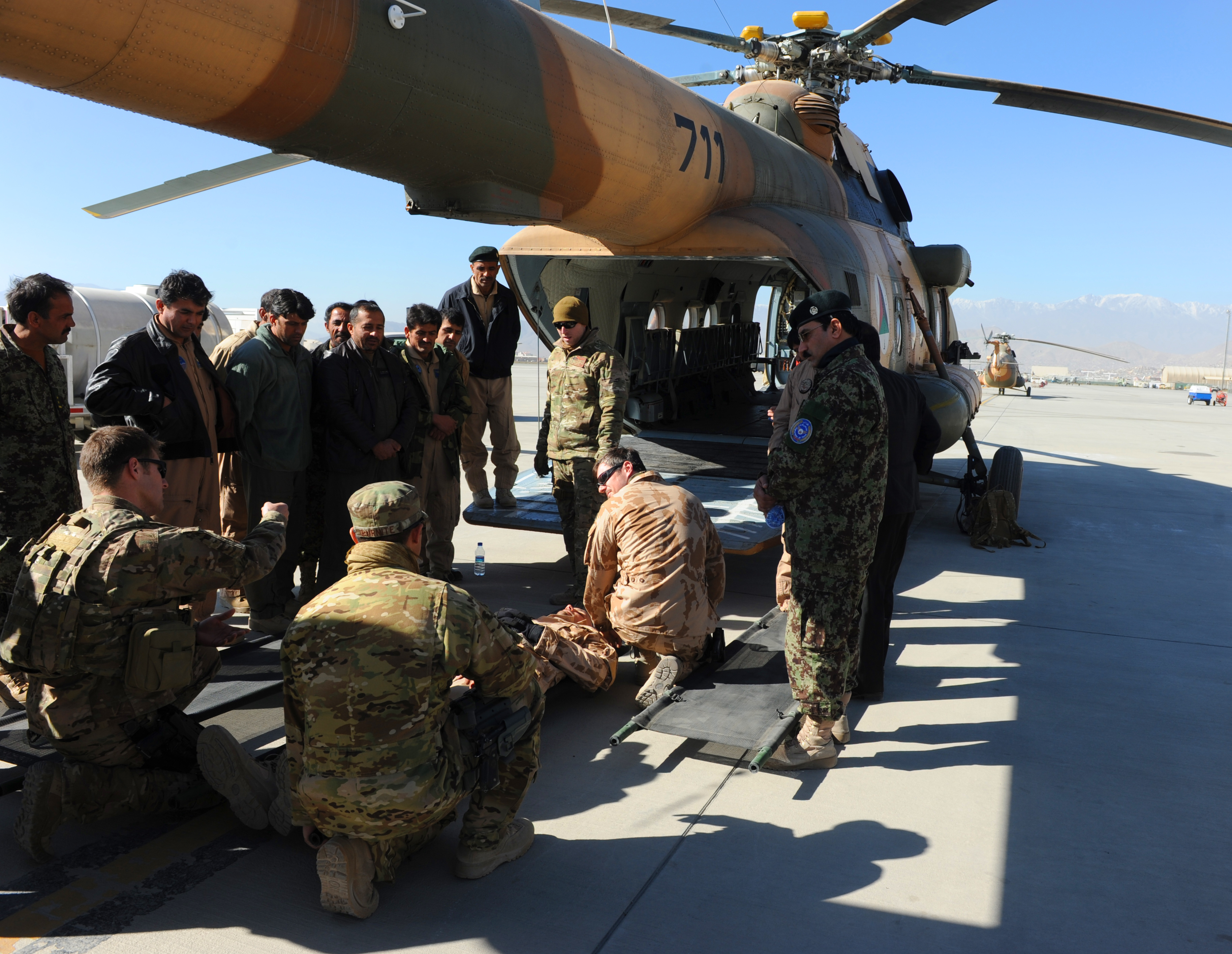 Afghan Air Force aircrew members watch as Coalition members from the 438th Air Expeditionary Advisory Squadron demonstrate proper litter carries onto a Mi-17 helicopter on Nov. 20, 2012 the Kabul, Afghanistan, International Airport. Three days were spent teaching basic medical training, medical and causality evacuation procedures to AAF flight engineers, pilots and aerial gunners.(U.S. Air Force photo/Staff Sgt. Melissa K. Mekpongsatorn)