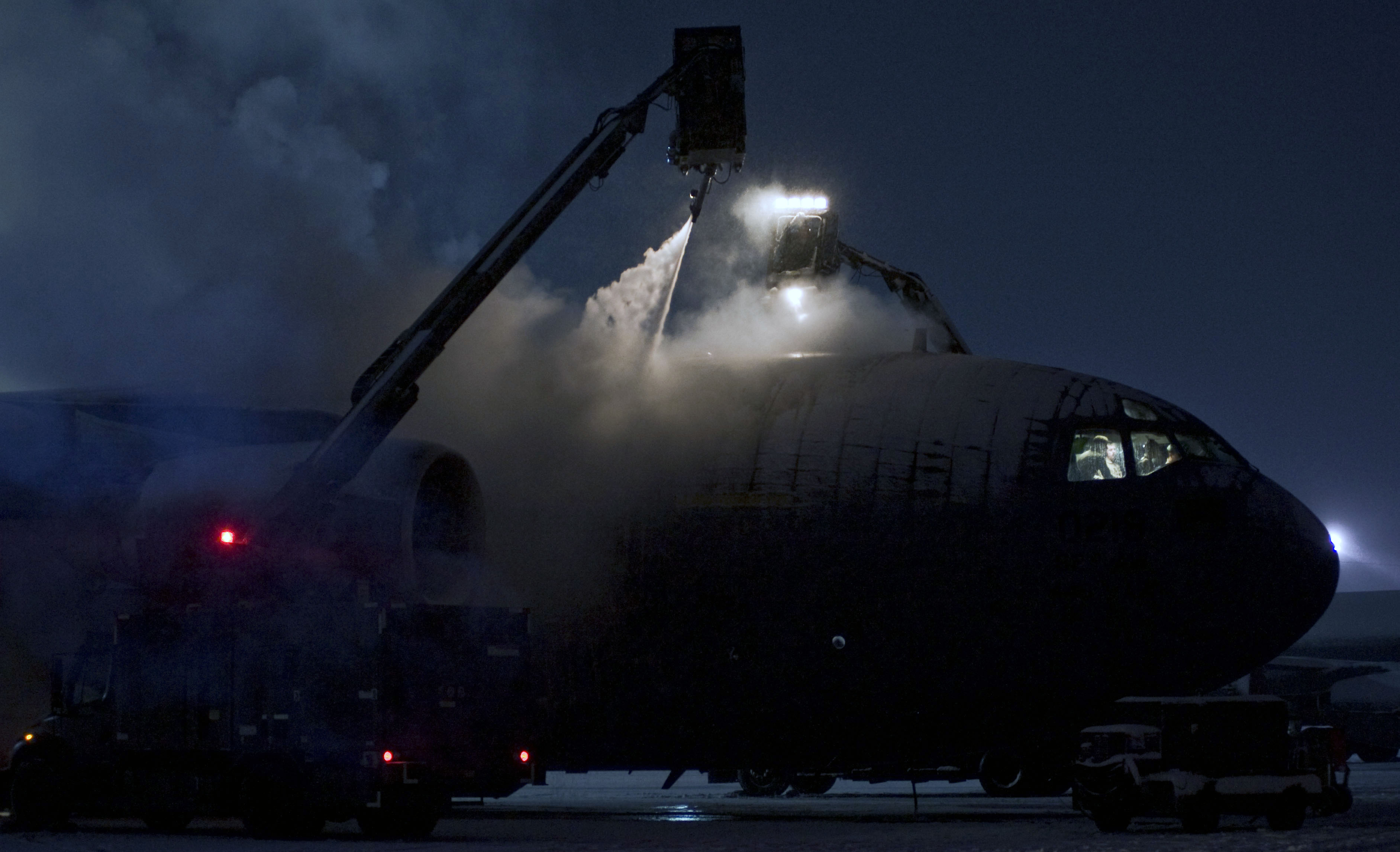 Maintenance crews work rapidly to deice a C-17 Globemaster III at Transit Center at Manas, Kyrgyzstan, Nov. 19, 2012. Removing the ice is a necessary procedure in order for the aircraft to depart safely and securely. Four deicing trucks worked consistenaly throughout the day to ensure continued support of the Transit Center?s primary missions set of airfueling and onward movement in direct support of international efforts in Afghanistan. (U.S. Air Force photo/Senior Airman Stephanie Rubi)