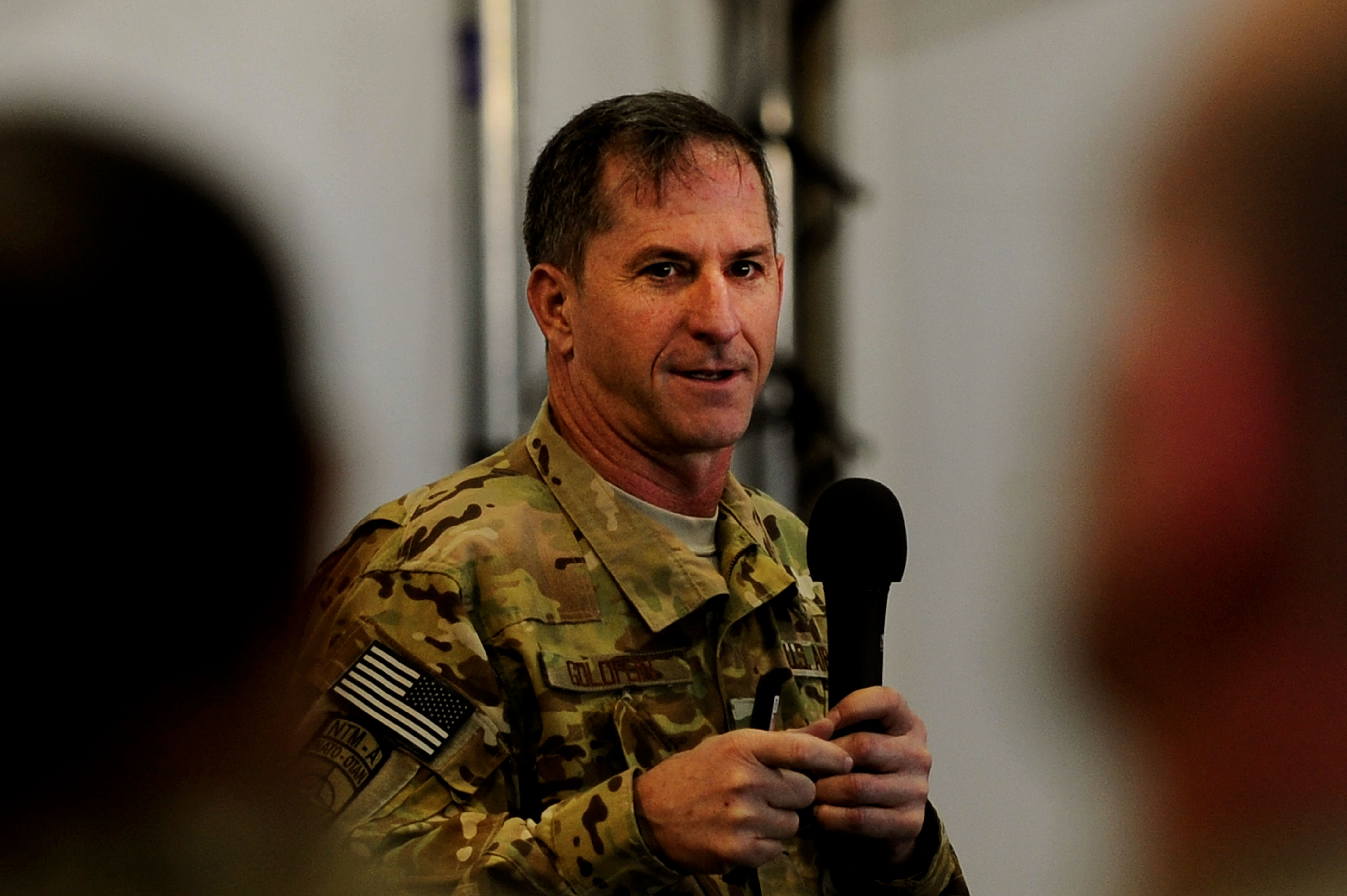 US Air Force Lt. Gen. David Goldfein talks with airman of the 838th Air Expeditionary Advisor Group at an all-call during his visit Sept. 20, 2012 at Shindad AB, Afghanistan. Goldfein is the commander of U.S. Air Forces Central Command, Southwest Asia, spent the day visiting with the Airmen and coalition members of the 838th AEAG. (U.S. Air Force photo/Tech. Sgt. Quinton Russ/RELEASED)