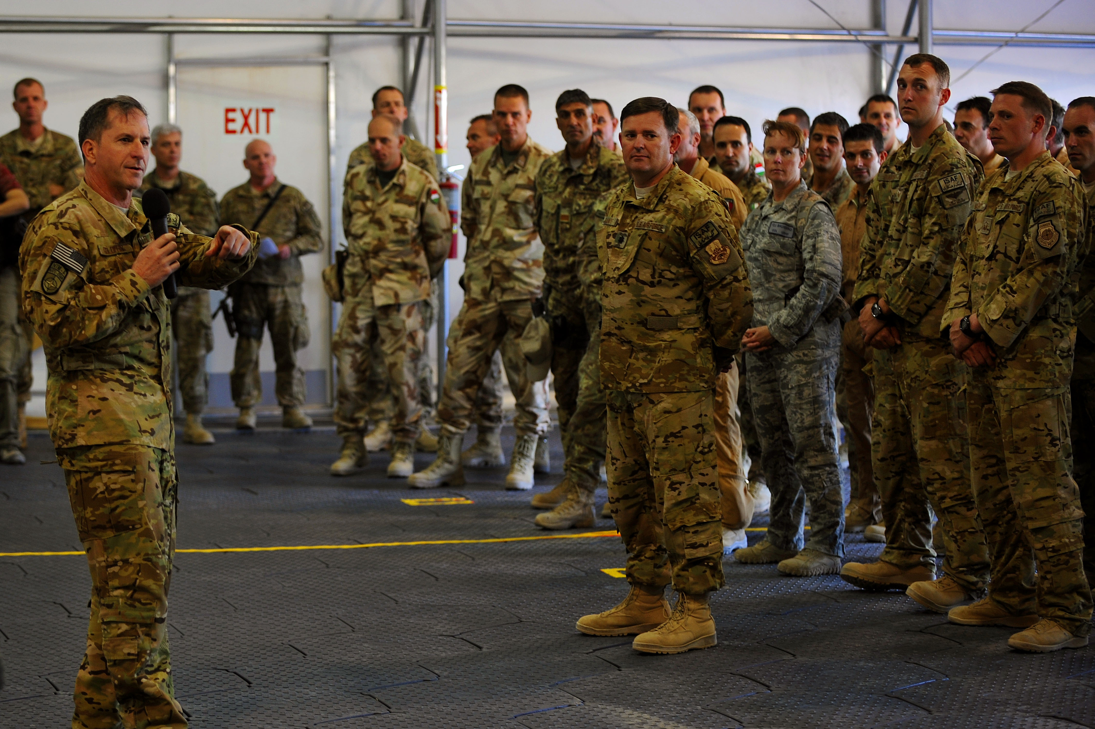US Air Force Lt. Gen. David Goldfein talks with airman of the 838th Air Expeditionary Advisor Group at an all-call during his visit Sept. 20, 2012 at Shindad AB, Afghanistan. Goldfein is the commander of U.S. Air Forces Central Command, Southwest Asia, spent the day visiting with the Airmen and coalition members of the 838th AEAG. (U.S. Air Force photo/Tech. Sgt. Quinton Russ/RELEASED)