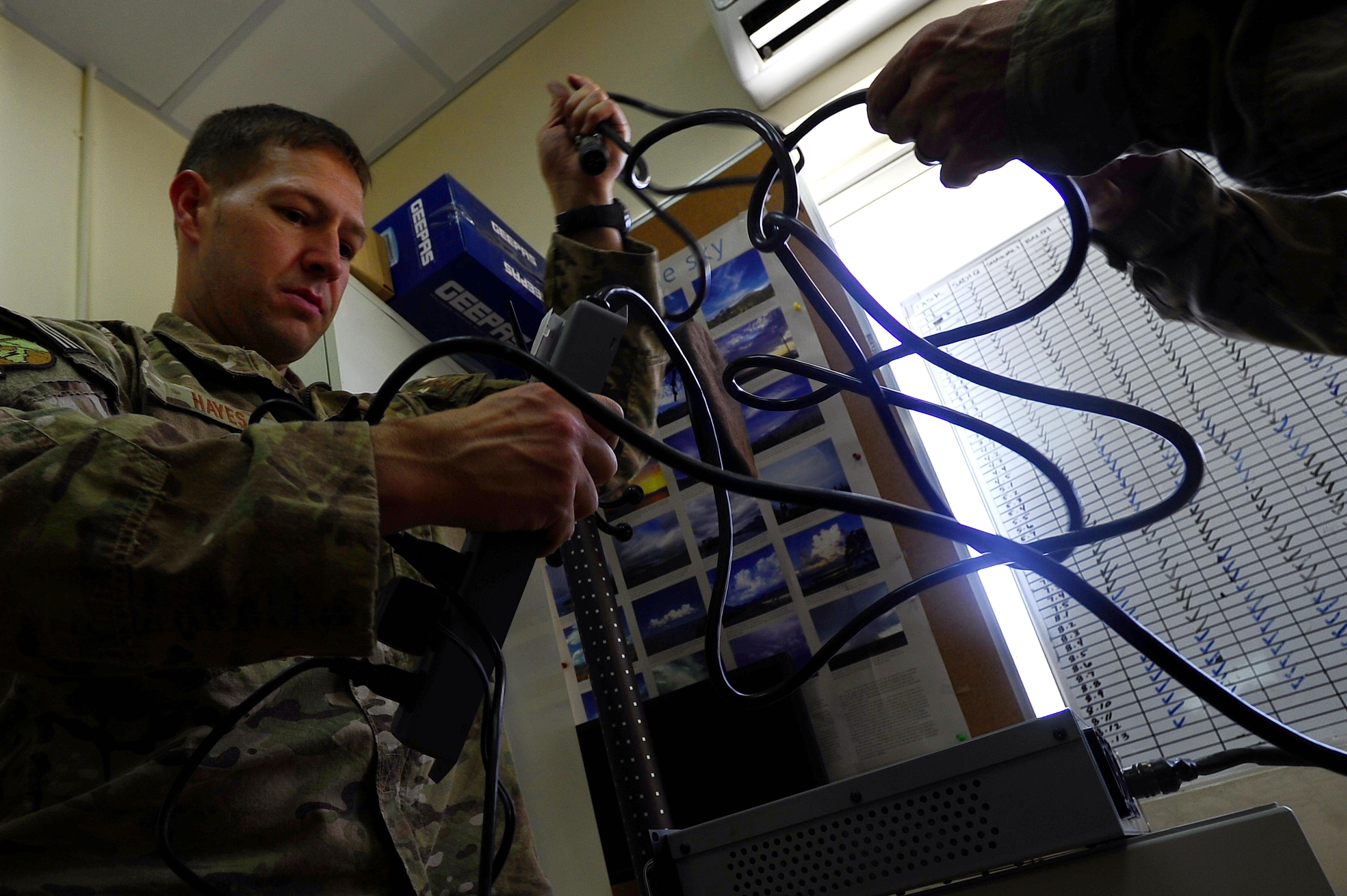 U.S. Air Force Tech. Sgt. Daniel Hayes gets a work station ready for a weather radar that will be used for early warning detection, Aug. 9, 2012 at the Kabul, Afghanistan, International Airport. Hayes is deployed to the 19th Expeditionary Weather Squadron, Bagram Air Base, Afghanistan, and assigned to the 2nd Combat Weather Squadron, Hurlbert Field, Fla. (U.S. Air Force photo/Tech. Sgt. Quinton Russ)