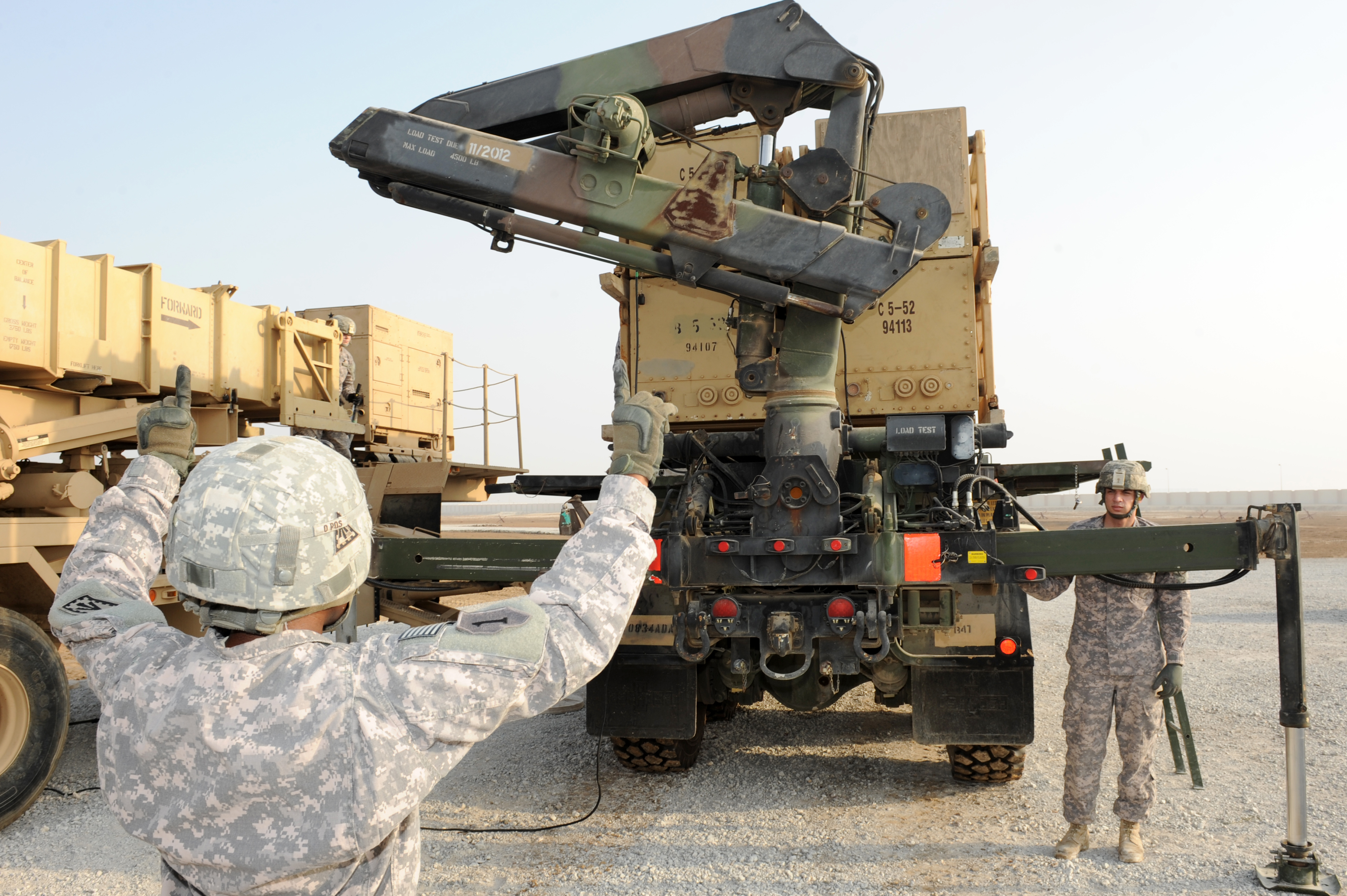SOUTHWEST ASIA - U.S. Army Sgt. Shantelle Campbell, signal person, directs crane operator Spc. Daniel Frederick during a missile reload certification Aug. 4, 2012. Campbell and Frederick are deployed with the 1st Battalion, 7th Air Defense Artillery Regiment from Fort Bragg, N.C. (U.S. Air Force photo/Master Sgt. Scott MacKay)