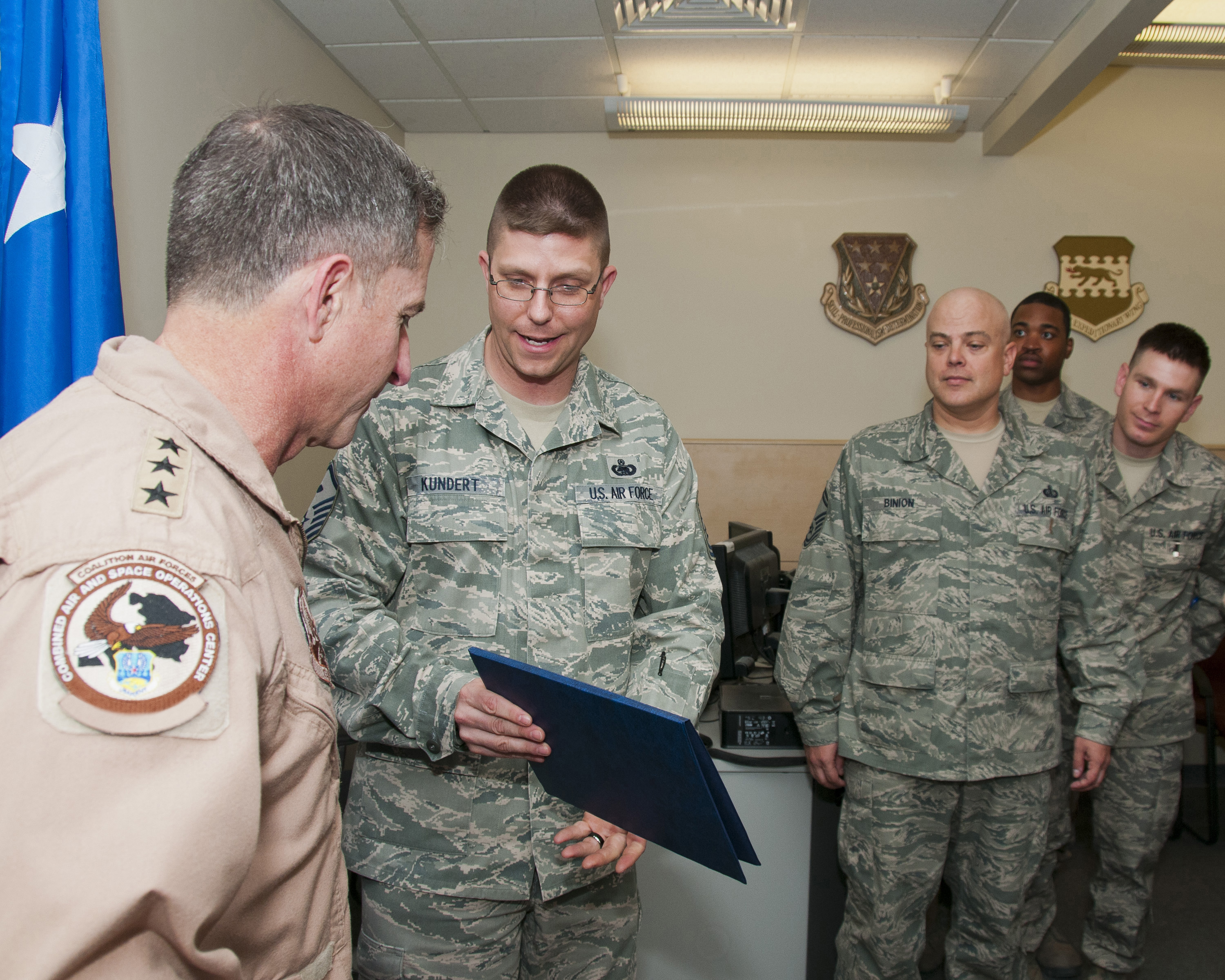 Lieutenant General David Goldfein, U.S. Air Forces Central (USAFCENT) Combined Forces Air Component Commander, receives an Associate Membership to the Air Force Sergeants Association, Grand Slam Chapter, by the HQ USAFCENT First Sergeant, Master Sergeant Kent Kundert, as other unit members look on in an undislosed location in Southwest Asia on June 27, 2012. (U.S. Air Force Photo by MSgt Andrew J. Moseley)