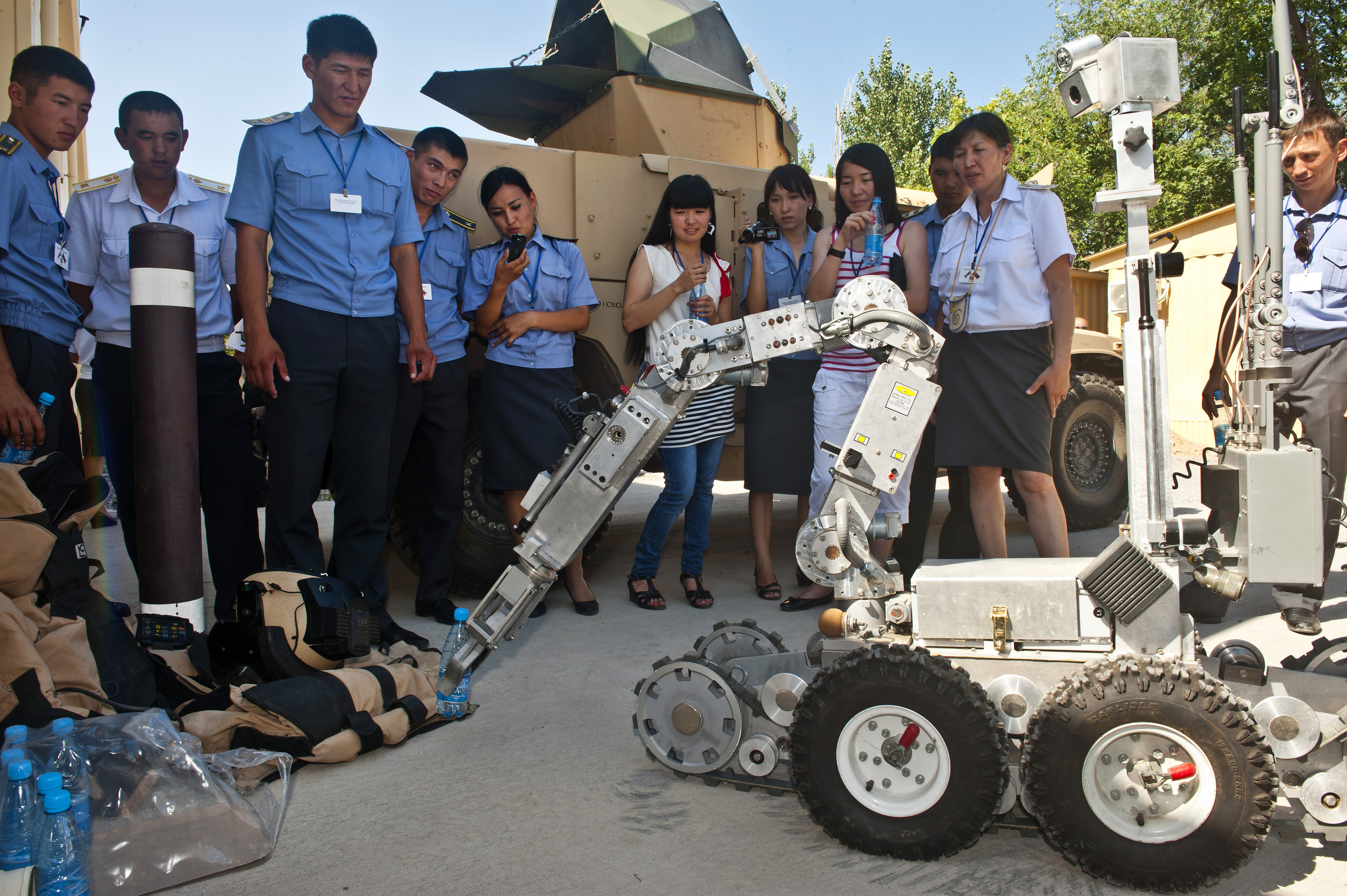 Members of the Bishkek Police Academy watch a demonstration of the Remote Ordnance Neutralization System robot at the Transit Center at Manas, Kyrgyzstan, June 21, 2012. The Explosives Ordnance Disposal flight demonstrated their mission capabilities during the visit to enhance relations and multi-national cooperation between the U.S. and Kyrgyz Republic. (U.S. Air Force photo/Senior Airman Brett Clashman)