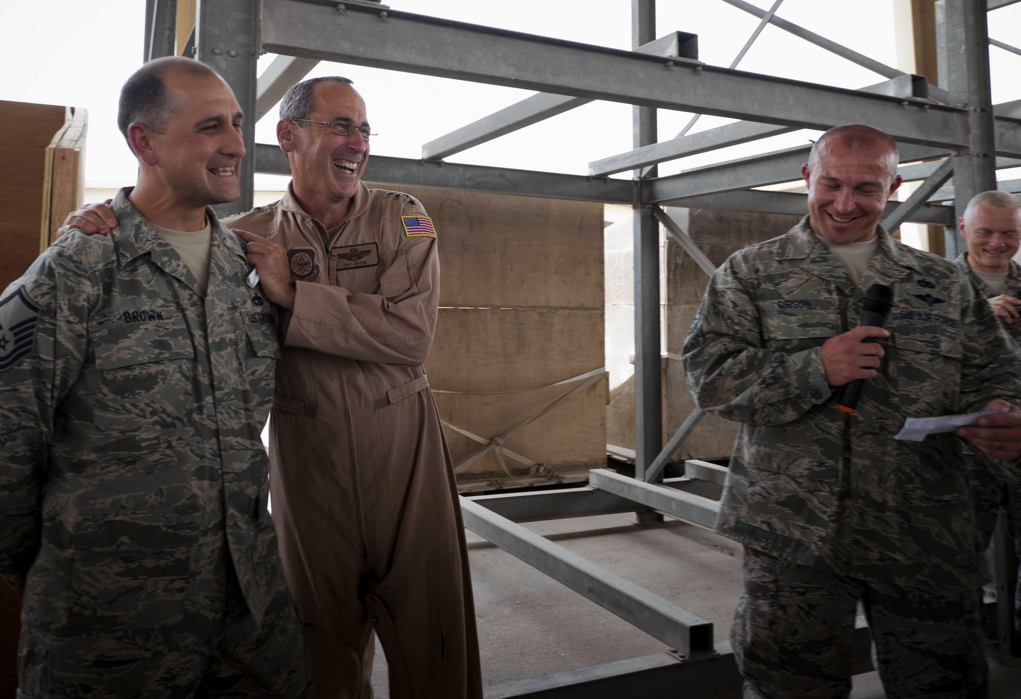 U.S. Air Force Gen. Raymond Johns, Air Mobility Command commander, shares a laugh with Airmen during the question and answer portion of his visit June 15, 2012, Southwest Asia. Johns visited the 8th Expeditionary Air Mobility Squadron and the 816th Expeditonary Airlift Squadron to assess current operations in theater and how AMC can better support the war fighting commanders as combat operations draw down. (U.S. Air Force photo/Staff Sgt. Sheila deVera)