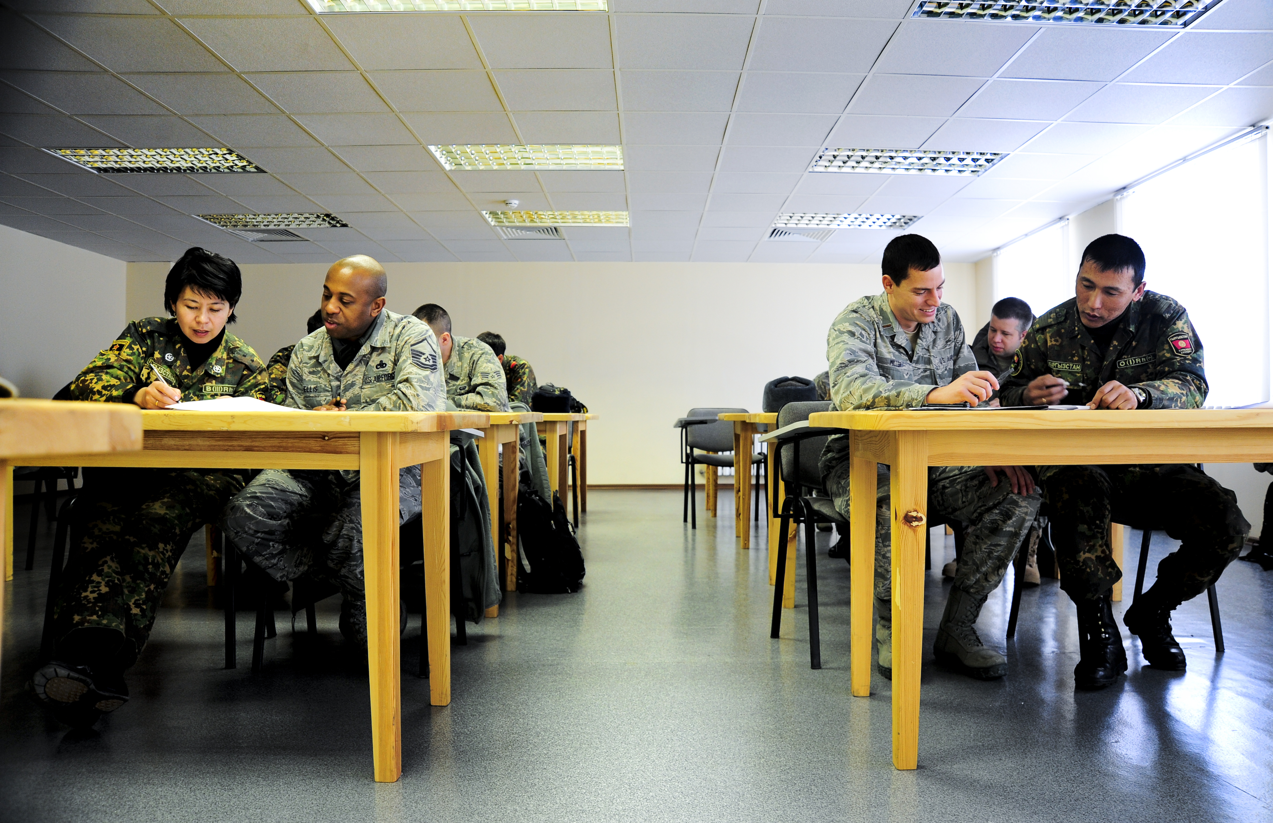 Service members from the Transit Center at Manas and the Koi Tash NCO Academy study together Jan. 26, 2012, during a language exchange in Koi Tash, Kyrgyzstan. Twenty people attended the exchange covering conversation basics in English, Russian and Kyrgyz.(U.S. Air Force Photo/Staff Sgt. Angela Ruiz)