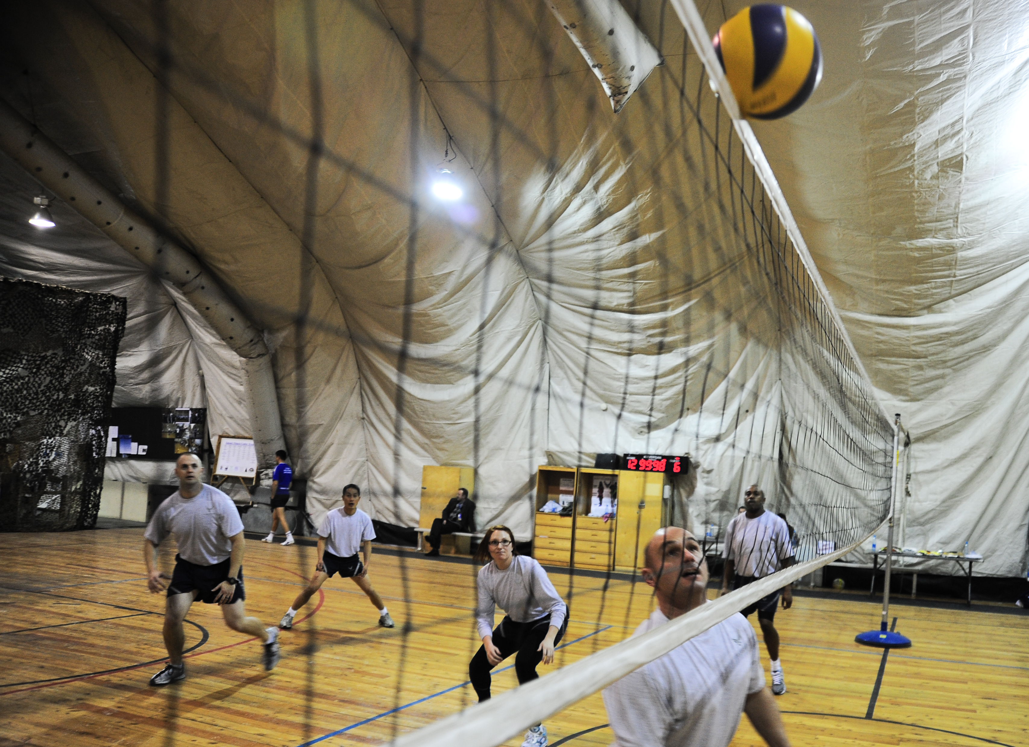 Master Sgt. Sam Nelson stands on the net watching intently as a volleyball slides along to top Jan. 20, 2012, while teammates stand ready at the Transit Center at Manas, Kyrgyzstan, during a game between Manas International Airport and the Transit Center. The teams competed in three games of single elimination, MIA won the final match. Nelson is the NCO in Charge of humanitarian assistance with the 376th Air Expeditionary Wing Theater Security Cooperation division. He is deployed to the here from Bellows Air Force Station, Hawaii. (U.S. Air Force Photo/Staff Sgt. Angela Ruiz)