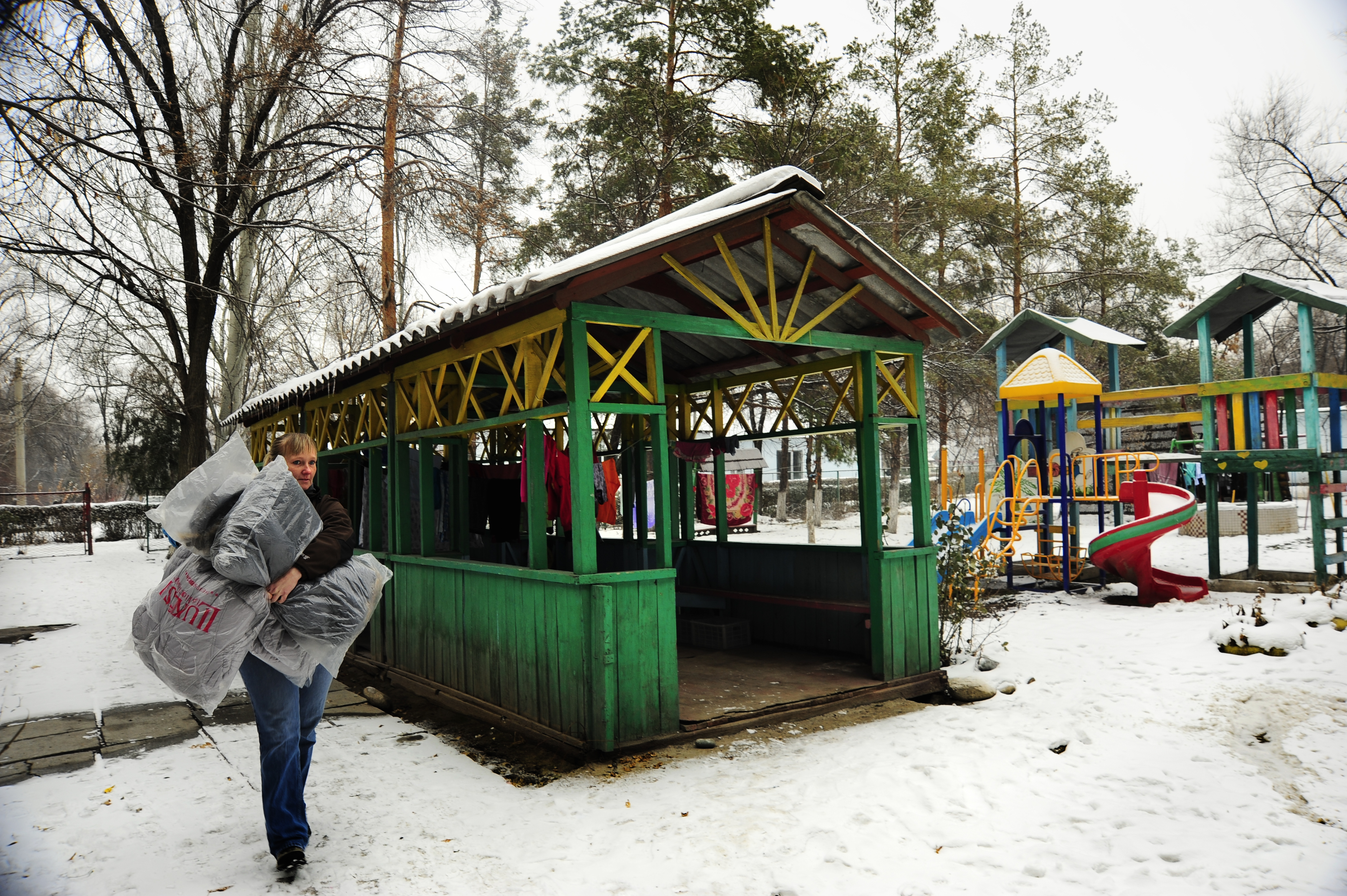 Tech. Sgt. Marlana Widdicombe carries children's coats Dec. 28, 2011, into the Children's Cancer Center in Bishkek, Kyrgyzstan. The Manas Area Benefit Outreach Society distributed more than 40 winter coats and blankets to the center on behalf of the Transit Center in Manas, the Kyrgyz Republic and the U.S. Embassy as part of a partnership called "Operation Warm and Dry." Widdicombe is a C-17 Globemaster III electrical and environmental systems craftsman from the 728th Aircraft Maintenance Squadron and is originally from Catasauqua, Pa.(U.S. Air Force Photo/Staff Sgt. Angela Ruiz)