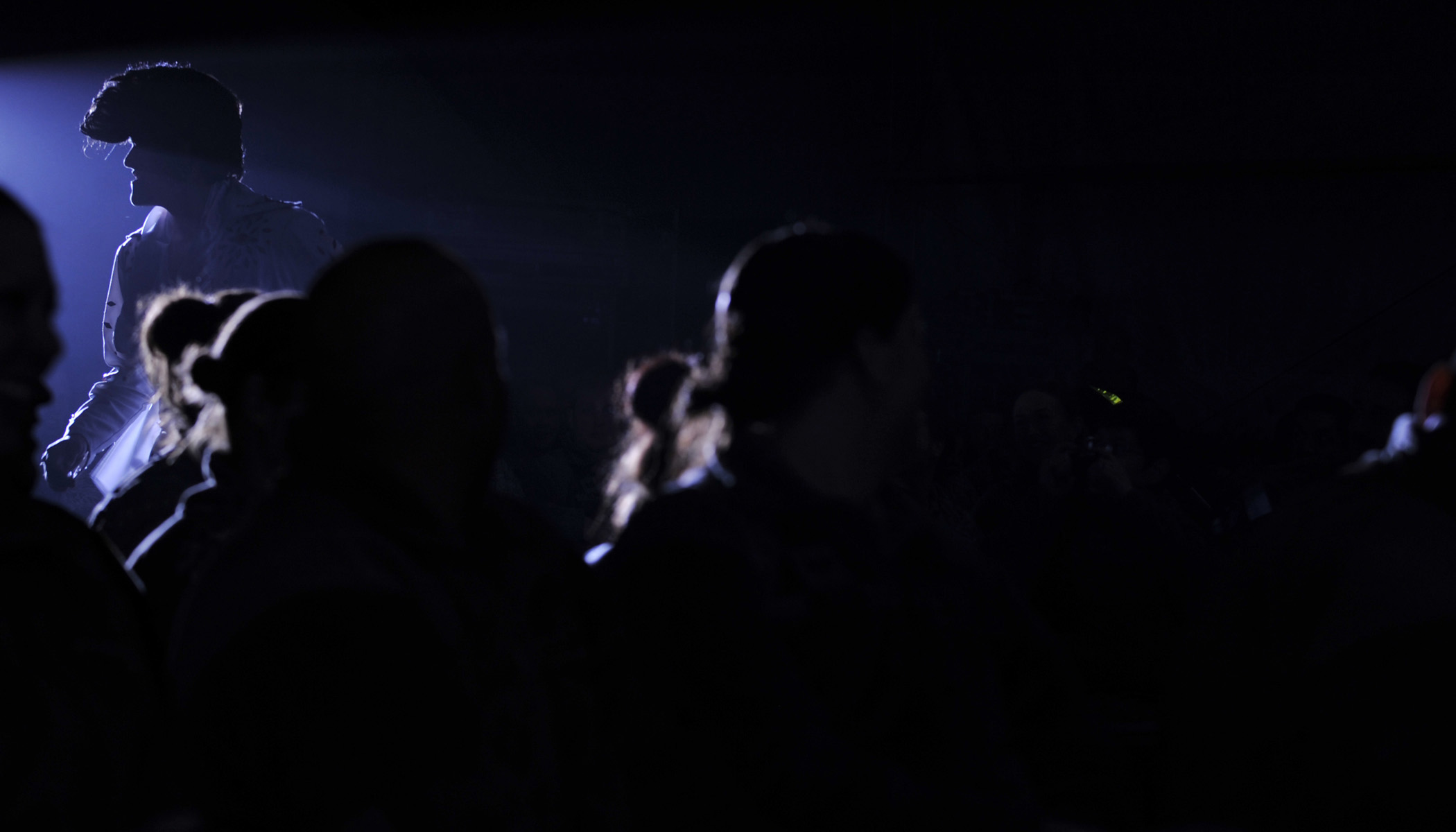 BAGRAM AIRFIELD, Afghanistan— A Tops in Blue 2011 member impersonates Elvis during the Tops in Blue show at Bagram Airfield, Dec 24, 2011. Tops in Blue is a touring performance group comprised of active duty Air Force members. . (U.S. Air Force photo/A1C Ericka Engblom)