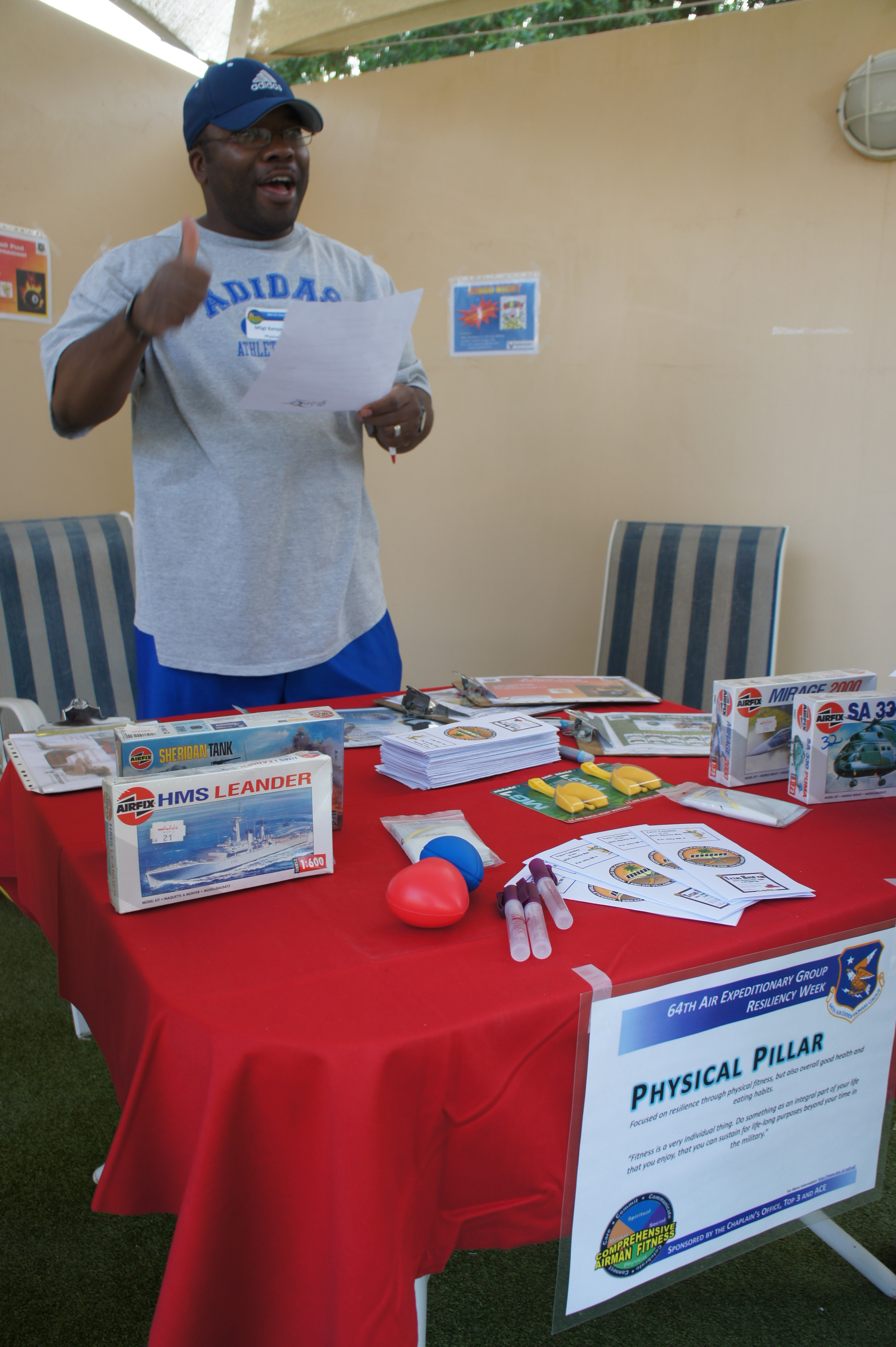 Master Sgt. Kenya Payne, 64th Services Flight Chief, quizzes visitors about the Air Force Physical Fitness test at the Physical Pillar booth during a Resiliency Week event in early November. (U.S. Air Force photo/Airman 1st Class Timothy McGuire)