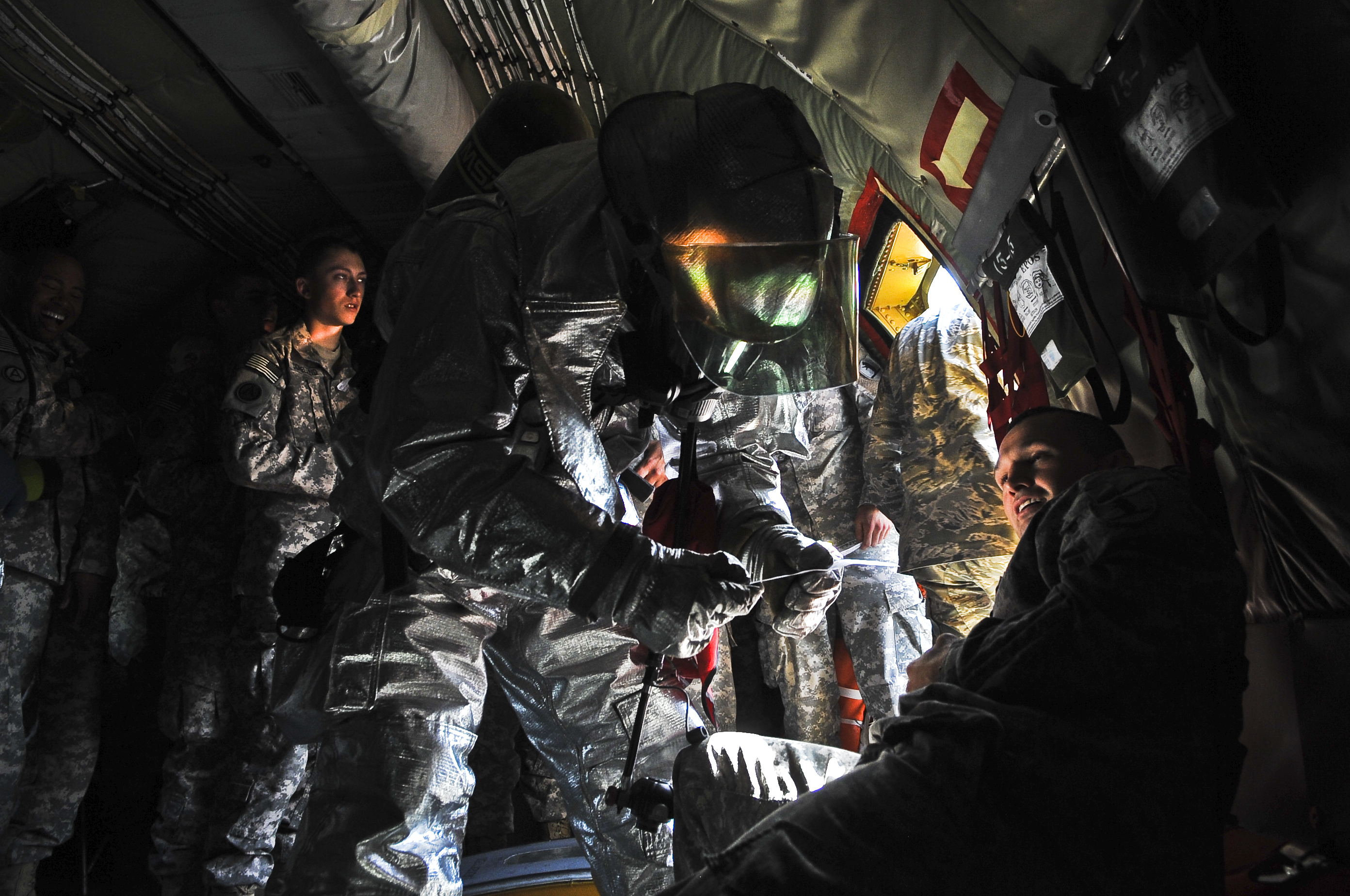 A firefighter from the 379th Expeditionary Civil Engineer Squadron reads an exercise inject card to assess the injuries of a simulated casualty aboard a KC-135 Stratotanker during a major accident response exercise Dec. 5, 2011, at an undisclosed location in Southwest Asia. The exercise was designed to test the 379th Air Expeditionary Wing’s ability to respond appropriately to an aircraft incident. Exercises validate training and provide a report card of the wing’s performance during high threat and high stress conditions. Exercises provide evaluators a means to validate processes, identify exploitable weaknesses and distribute best practices throughout the base. (U.S. Air Force photo/Senior Airman Paul Labbe)