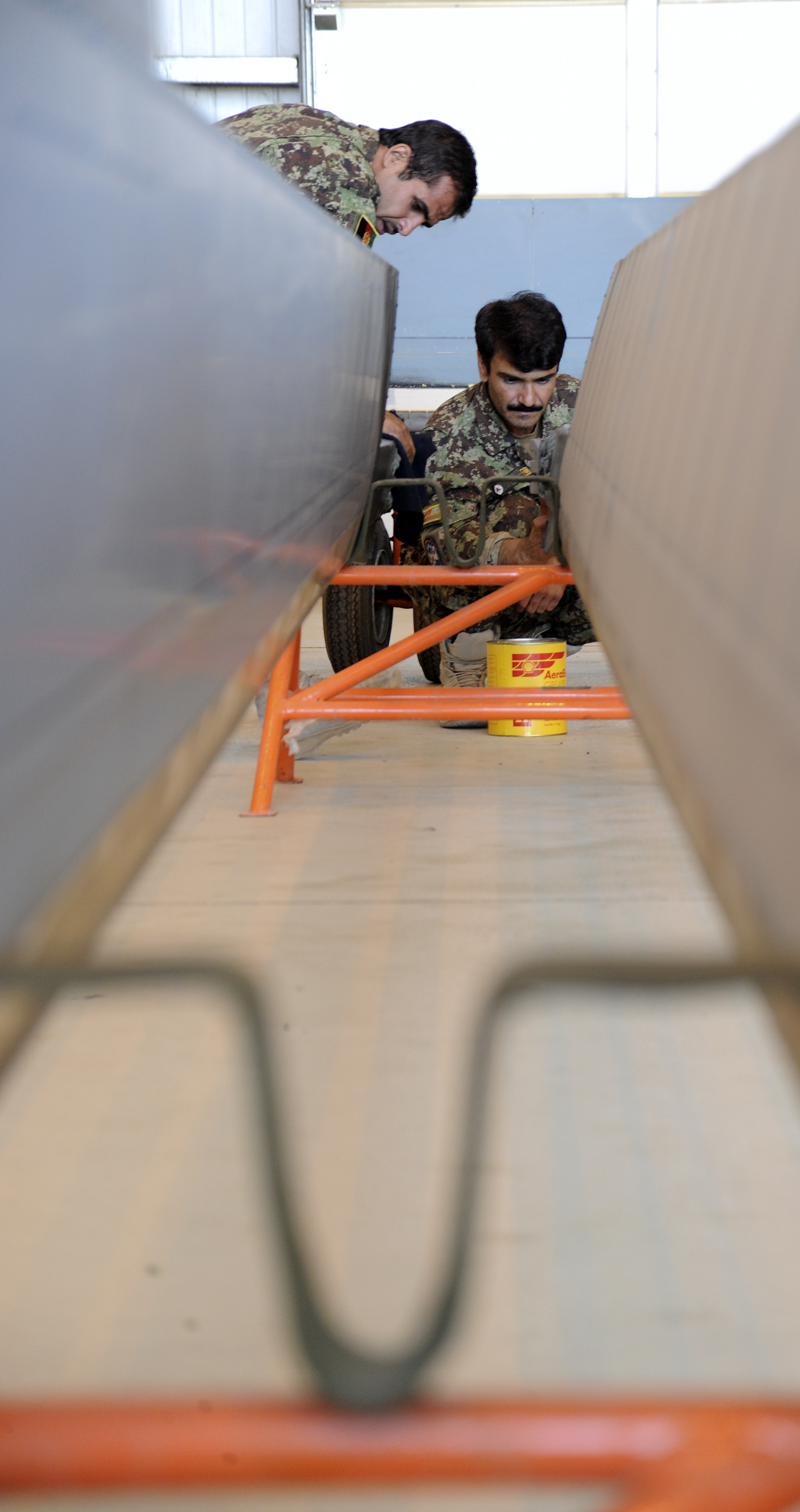 Afghan Air Force airmen clean the rotor blade of a Mi-17 helicopter in a maintenance hangar at Kabul International Airport, Kabul, Afghanistan, September 26, 2011. The maintenance was being performed on the helicopter as part of its hourly flight maintenance requirement. (U.S. Air Force photo by Staff Sgt. Matthew Smith)