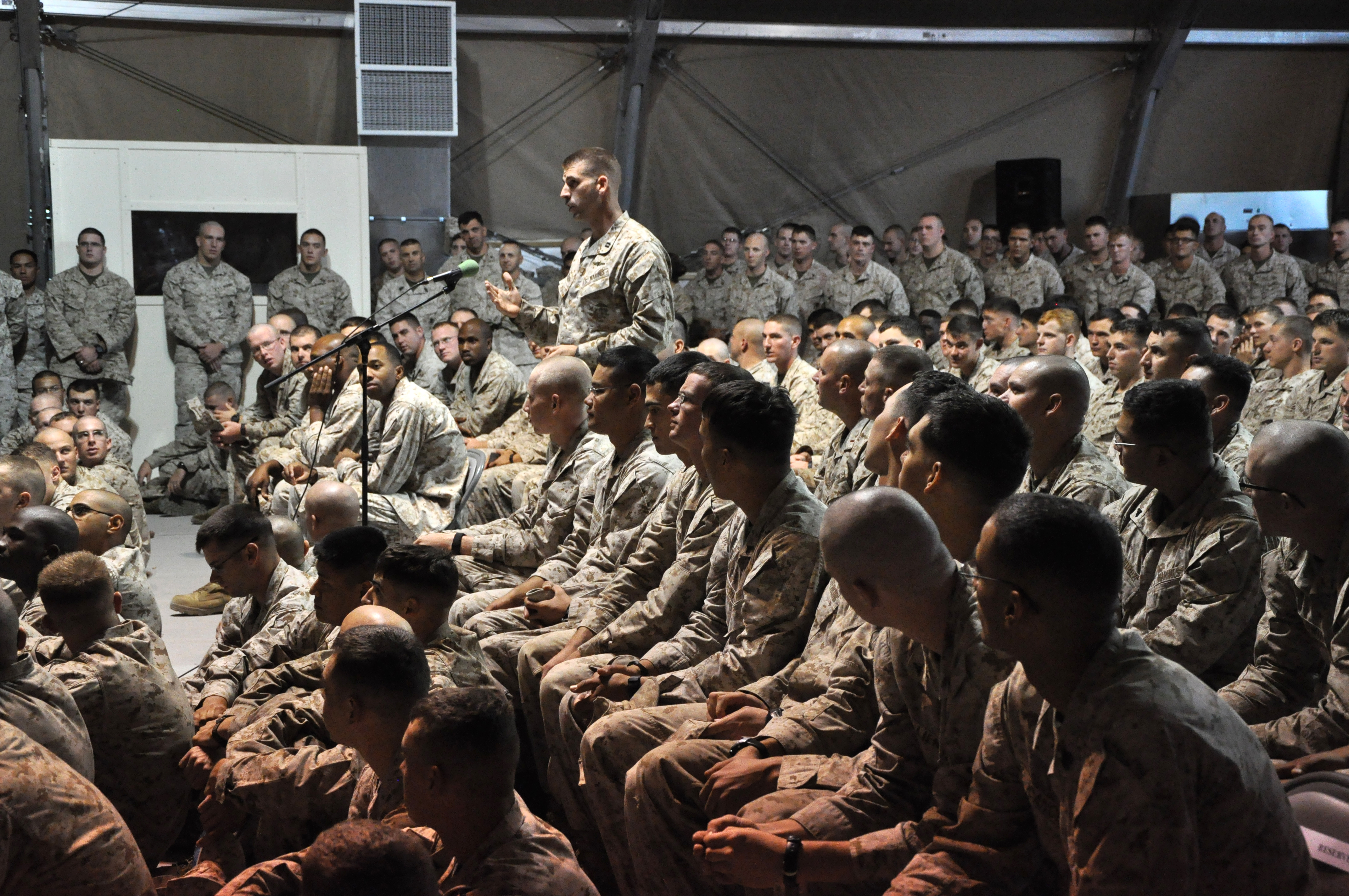 A Marine captain asks Secretary of the Navy Ray Mabus a question about the troop withdrawal timeline during his visit to Transit Center at Manas, Kyrgyzstan, Sept. 21, 2011. Secretary Mabus visited with the 850 Marines at the Transit Center, many on their way into Afghanistan. (U.S. Air Force photo/Master Sgt. Cindy Dorfner)