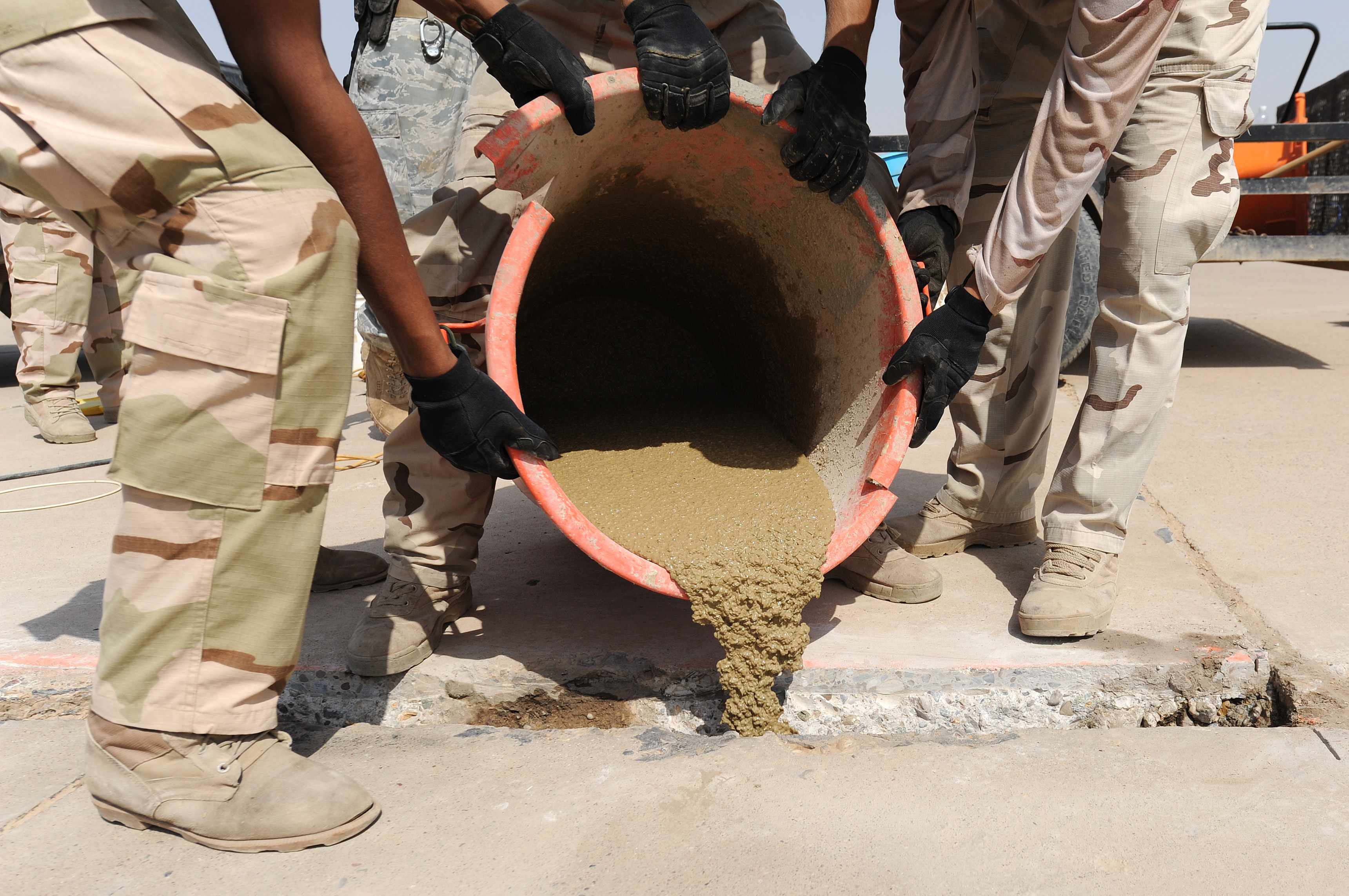 Members of the Iraqi Air Force help pour a cement mixture into a newly made hole on the flightline at Kirkuk Air Base. Over the past six months Expeditionary Operations Support Squadron has been going out on the flightline with the Iraqis teaching them how to take care of their runway. (U.S. Air Force photo by Senior Airman Tristin English)