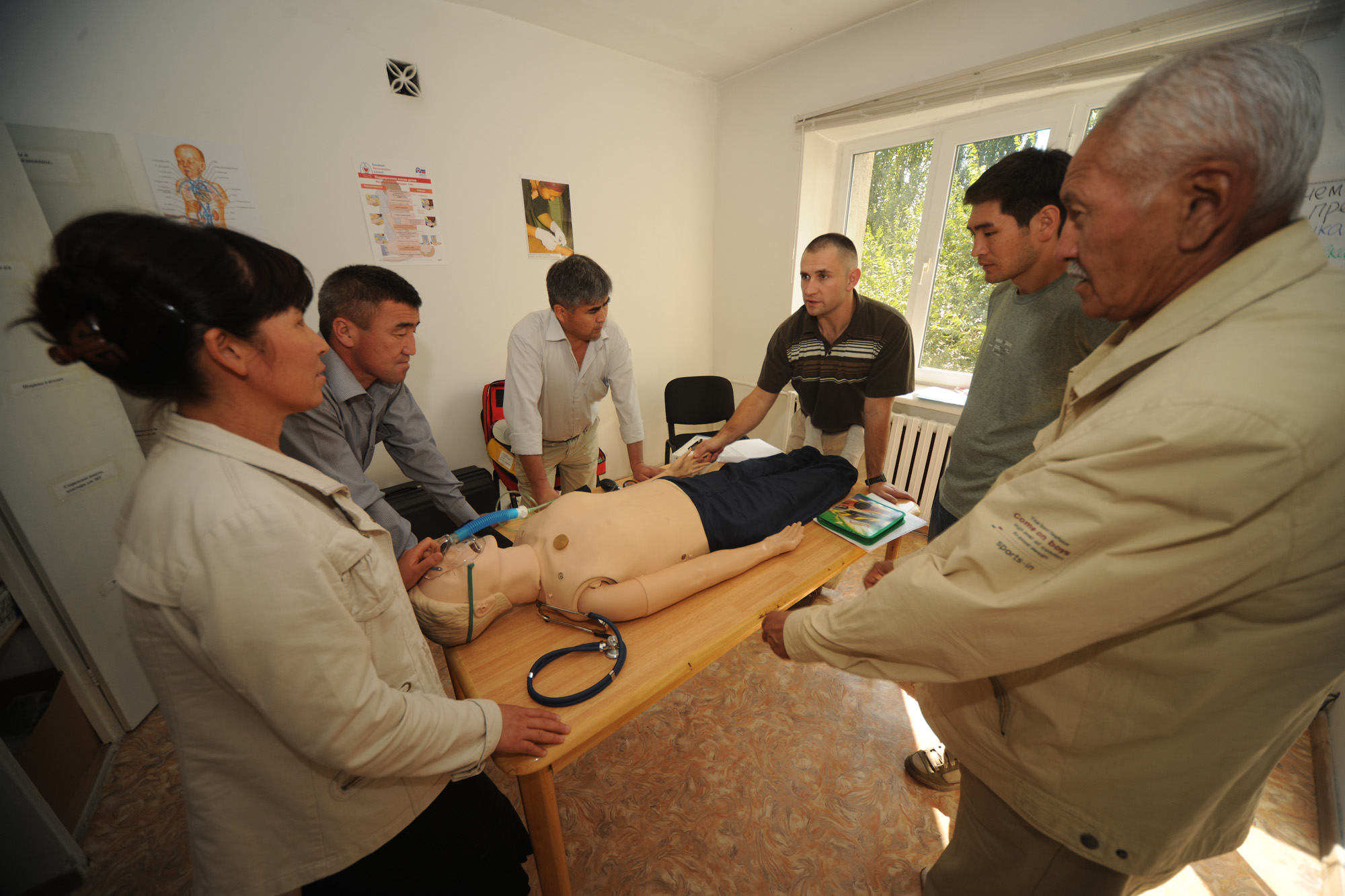 BISHKEK, Kyrgyzstan ? Dr. (Capt.) Richard Speakman, center, 376th Expeditionary Medical Group, Transit Center at Manas, discusses medical emergencies that involve a patient suffering from shortness of breath. From left, doctors Turgunbaeva Sarpia, Orosbaeu Tolkun, Mursaev Bakodir, Uran Kamchybekov and Abaliev Imamasan discuss a possible diagnosis. Three Transit Center doctors took part in this international effort to help Kyrgyzstan build its emergency medical care capability by training 14 local medical doctors and surgeons during a two-week course that concluded Sept. 18 at the Kyrgyz State Medical Institute for Retraining and Continuous Education. (U.S. Air Force Photo/Tech. Sgt. Jennifer Buzanowski)
