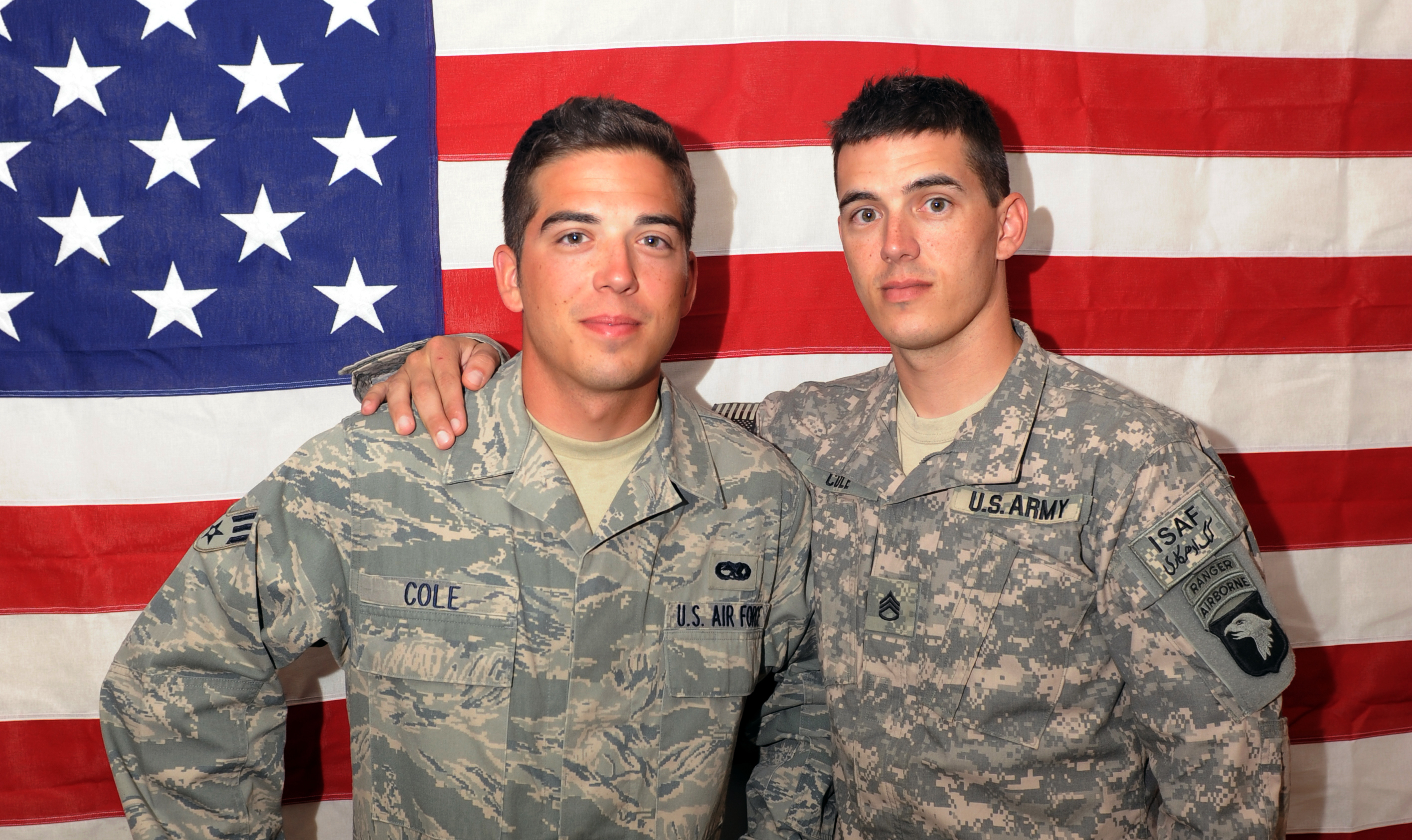 U.S. Army Staff Sgt. Jonathan Cole (left), a member of the 101st Airborne Division, and U.S. Air Force Senior Airman William Ashton Cole (right), a member of the 336th Aircraft Maintenance Unit, stand together at Bagram Airfield, Afghanistan. The Gastonia, N.C. natives are brothers and currently serving in Afghanistan.(U.S. Air Force Photo/Tech. Sgt. Drew Nystrom