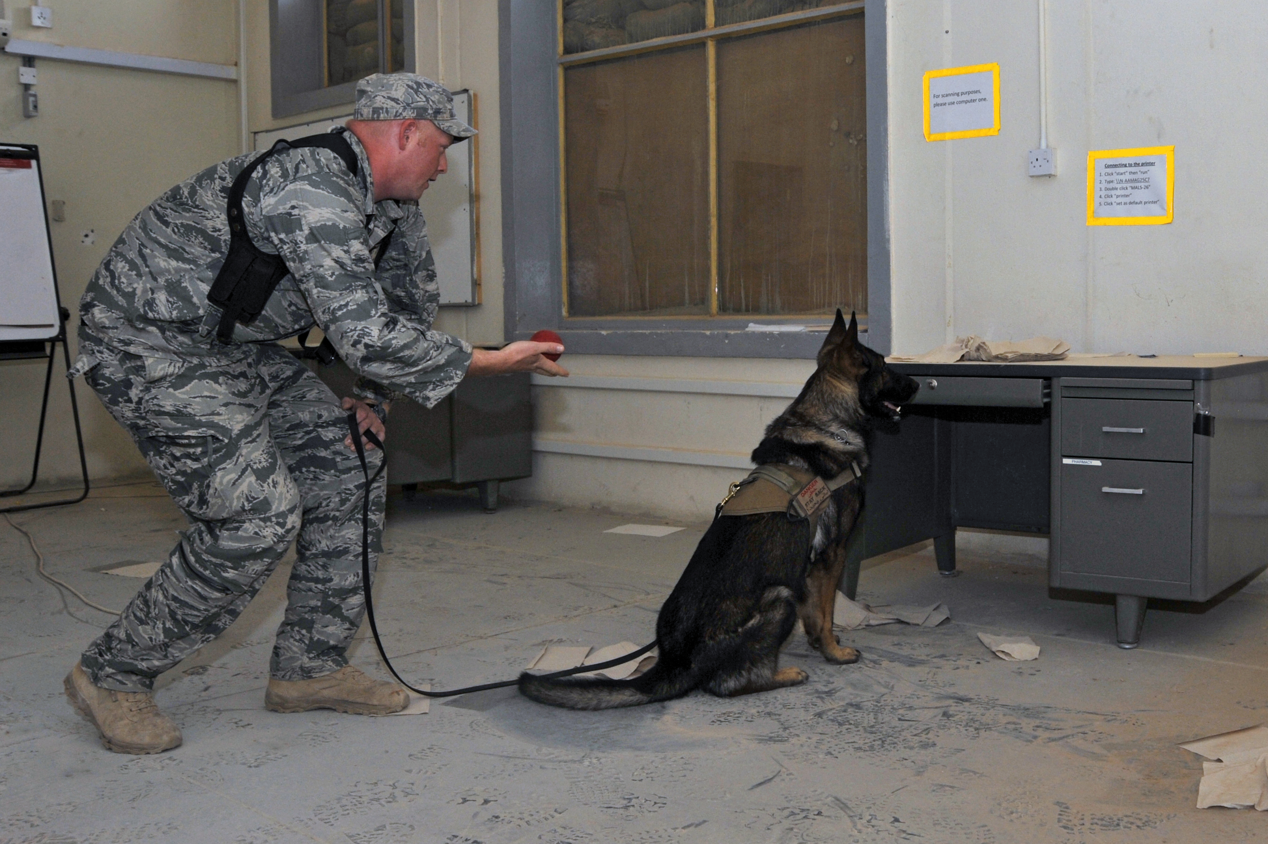 Ali, a military working dog, sits and waits for his prize from his handler, Staff Sgt. Dustin Weeks, after discovering hidden C4 explosives in a desk during training July, 25 2010 at Al Asad Air Base, Iraq. The MWD handlers train their dogs at least once a week to keep their skills proficient.( U.S. Air Force photo by Senior Airman Perry Aston) (Released)