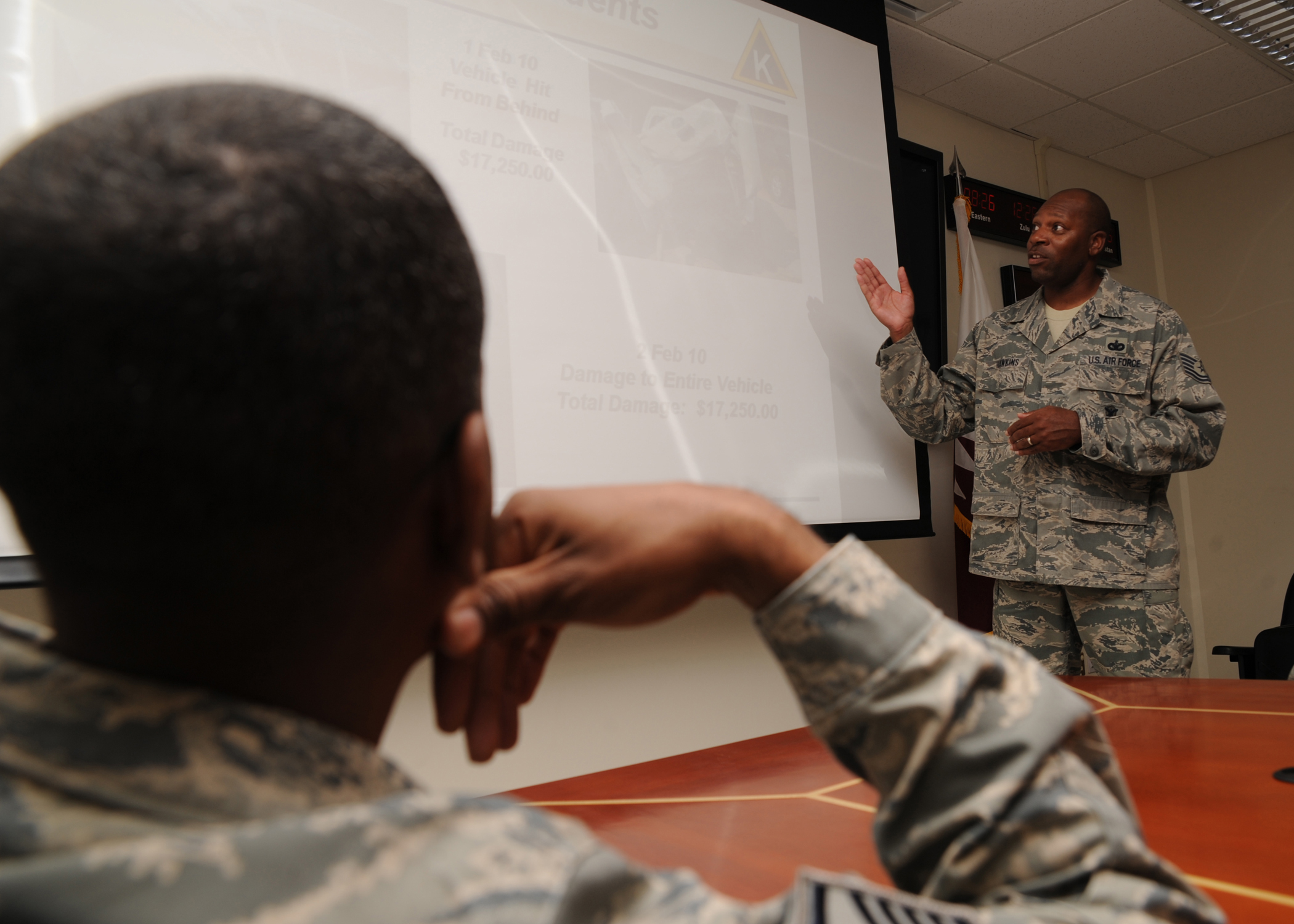 Tech. Sgt. Steven Hawkins shows a briefing for off-base driving at an undisclosed location in Southwest Asia July 21. Sergeant Hawkins is the force protection NCOIC with the 379th Air Expeditionary Wing. (U.S. Air Force photo/Senior Airman Katie Gieratz)