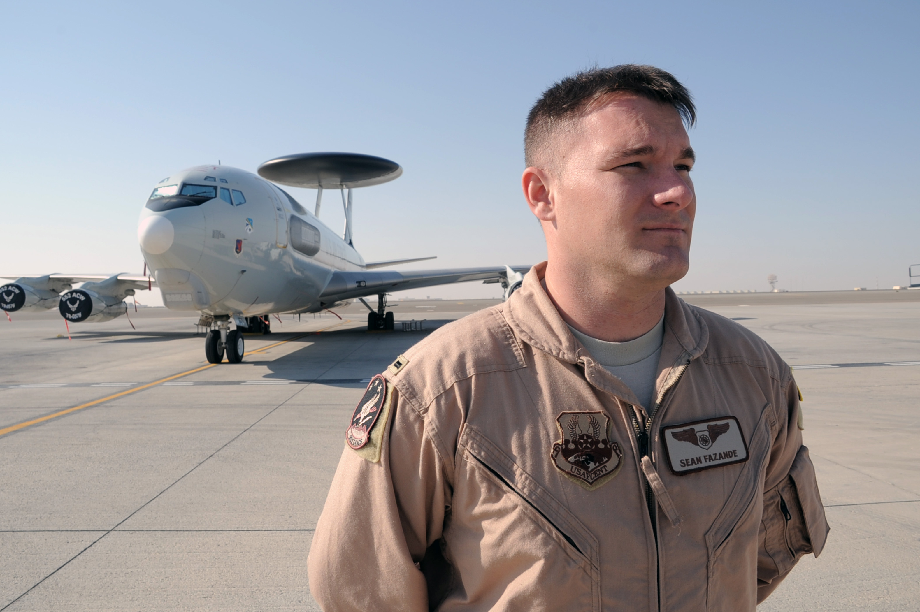 First Lt. Sean Fazande is an air weapons officer with the 965th Expeditionary Airborne Air Control Squadron at a non-disclosed base in Southwest Asia. Here he is pictured with the main airframe, the E-3 Sentry Airborne Warning and Control System aircraft, that he flies on to do is job. Deployed from the 965th AACS at Tinker Air Force Base, Okla., the lieutenant is a prior U.S. Navy aircraft mechanic who became an Air Force officer. The lieutenant's hometown is Destrehan, La. (U.S. Air Force Photo/Tech. Sgt. Scott T. Sturkol/Released)