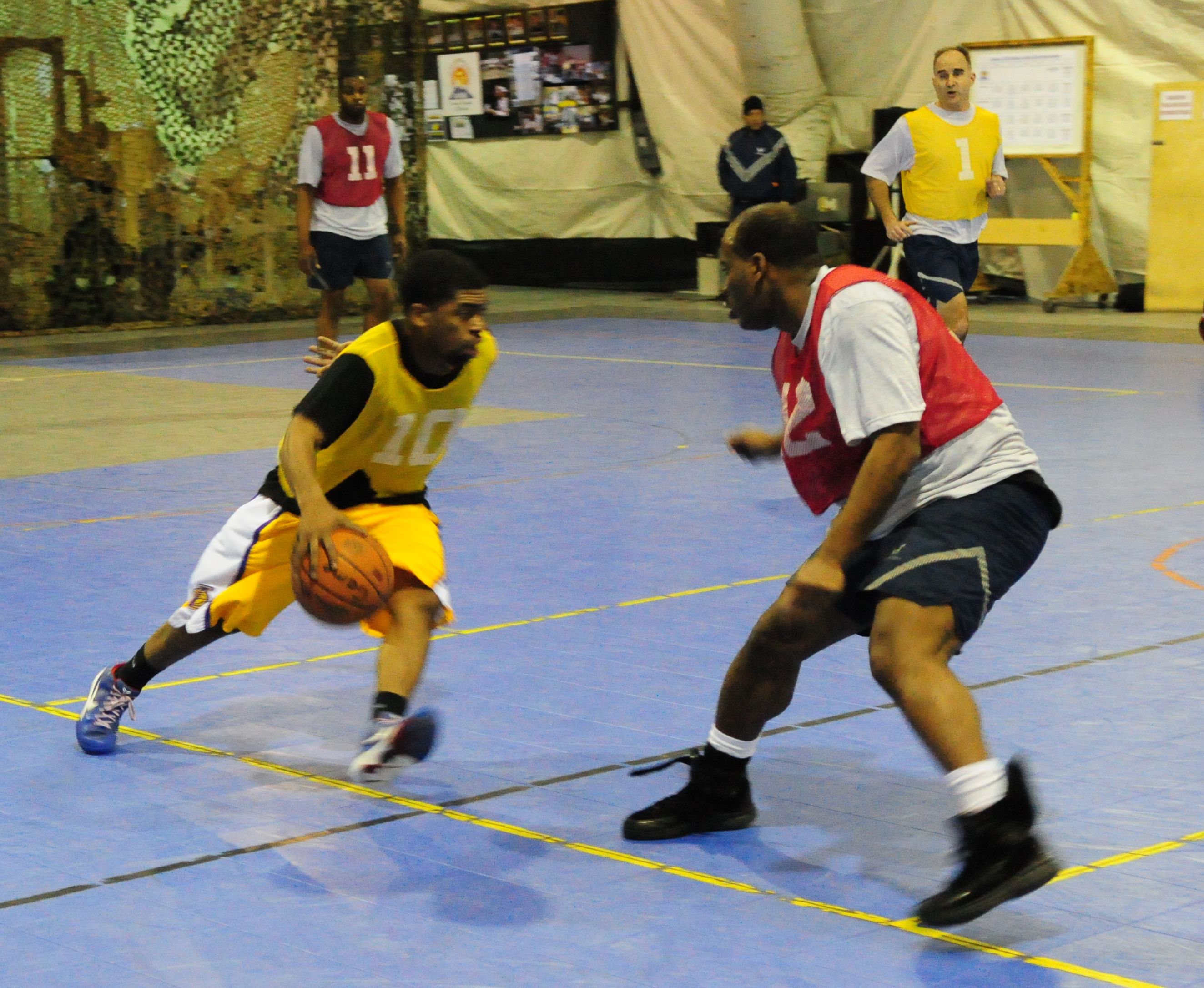 Brandon Boswell, guard for the 376th Expeditionary Mission Support Group basketball team, dribbles around the 376th Expeditionary Logistics Readiness Squadron defense during the Transit Center at Manas’s intramural championship basketball game Jan. 18, 2010. The 376th ELRS team defeated the 376th EMSG 36-32. (U.S. Air Force photo/ Senior Master Sgt. Mike Litsey/Released)