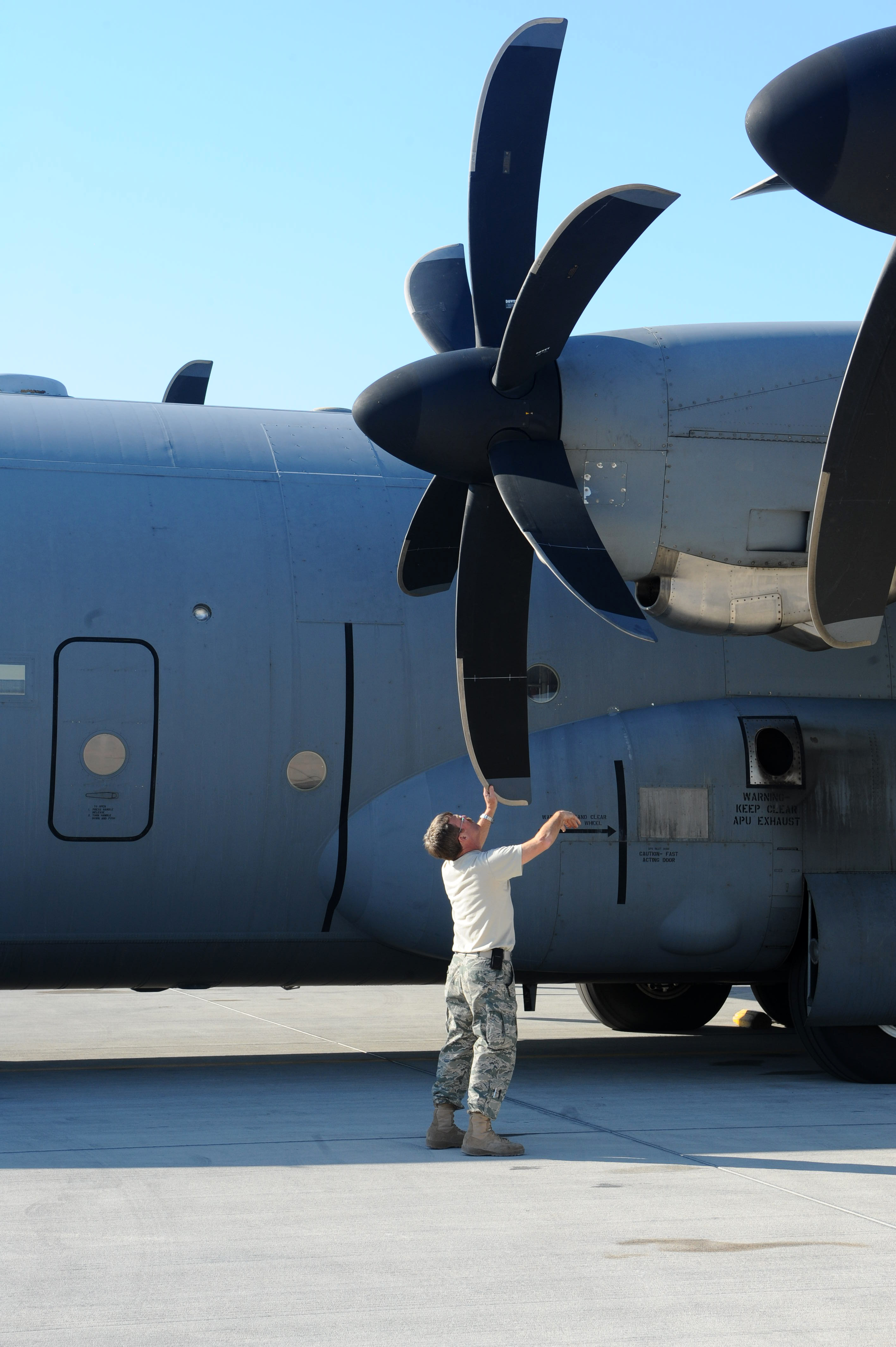 100109-F-3622Z-013 Chief Master Sgt. Michael Watson, 746th Expeditionary Airlift Squadron operations superintendant, inspects the propellers of a C-130 Hercules as part of the pre-flight checklist at a non-disclosed Southwest Asia location Jan. 9, 2010. (U.S. Air Force photo by Senior Airman Kasey Zickmund)[RELEASED]