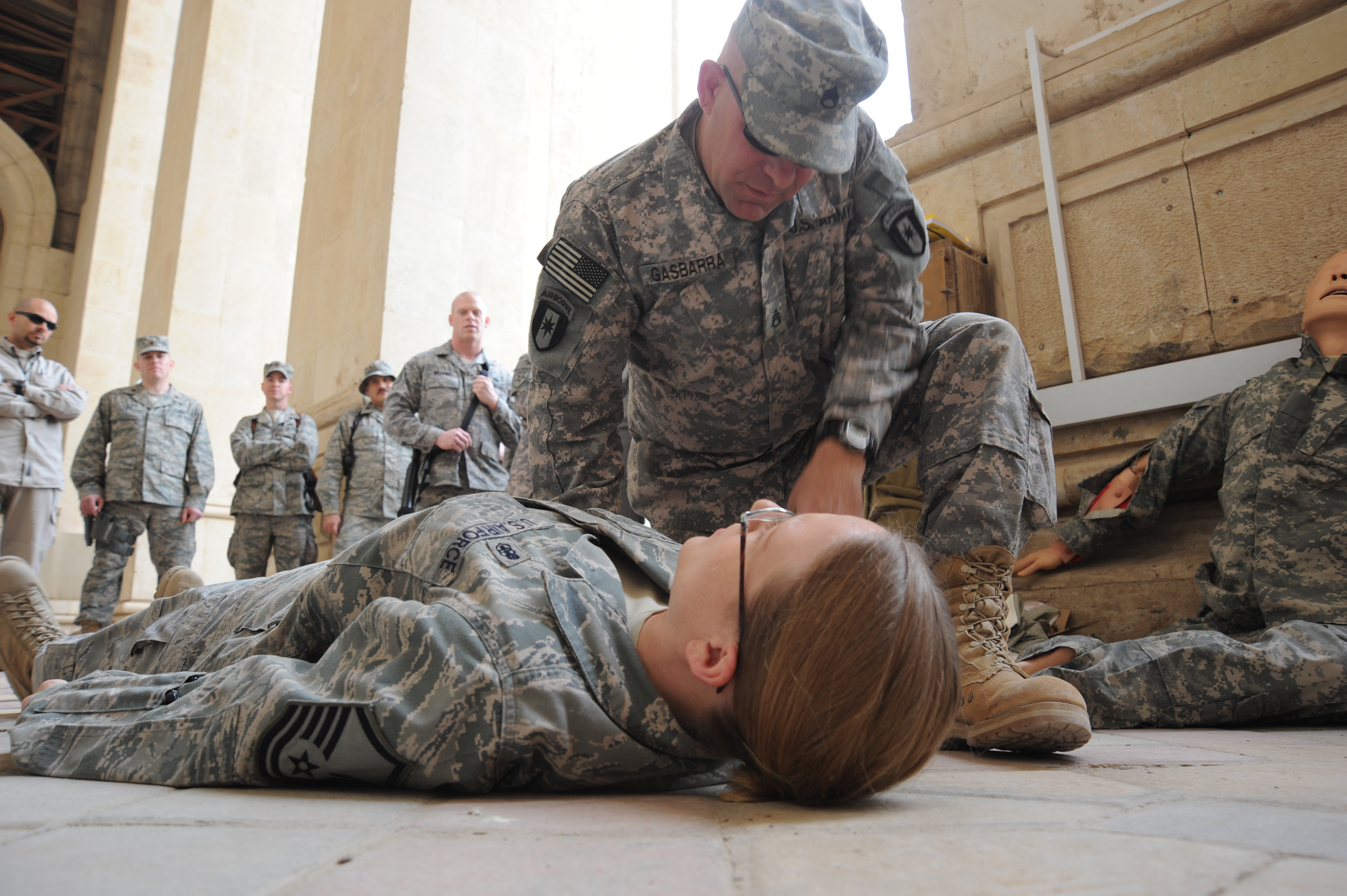 U.S. Army Staff Sgt. Albert Gasbarra, noncommissioned officer in charge of the troop medical clinic for the 550th Aerial Support Medical Company, demonstrates how to approach an injured individual during the combat lifesaver training course Dec. 29, 2009. The students were given opportunities to practice lifesaving skills during the exercise portion of the course. Sergeant Gasbarra is deployed from Fort Bragg, N.C., and hails from Peekskill, N.Y. (U.S. Air Force photo/Master Sgt. Trish Bunting/ Released)