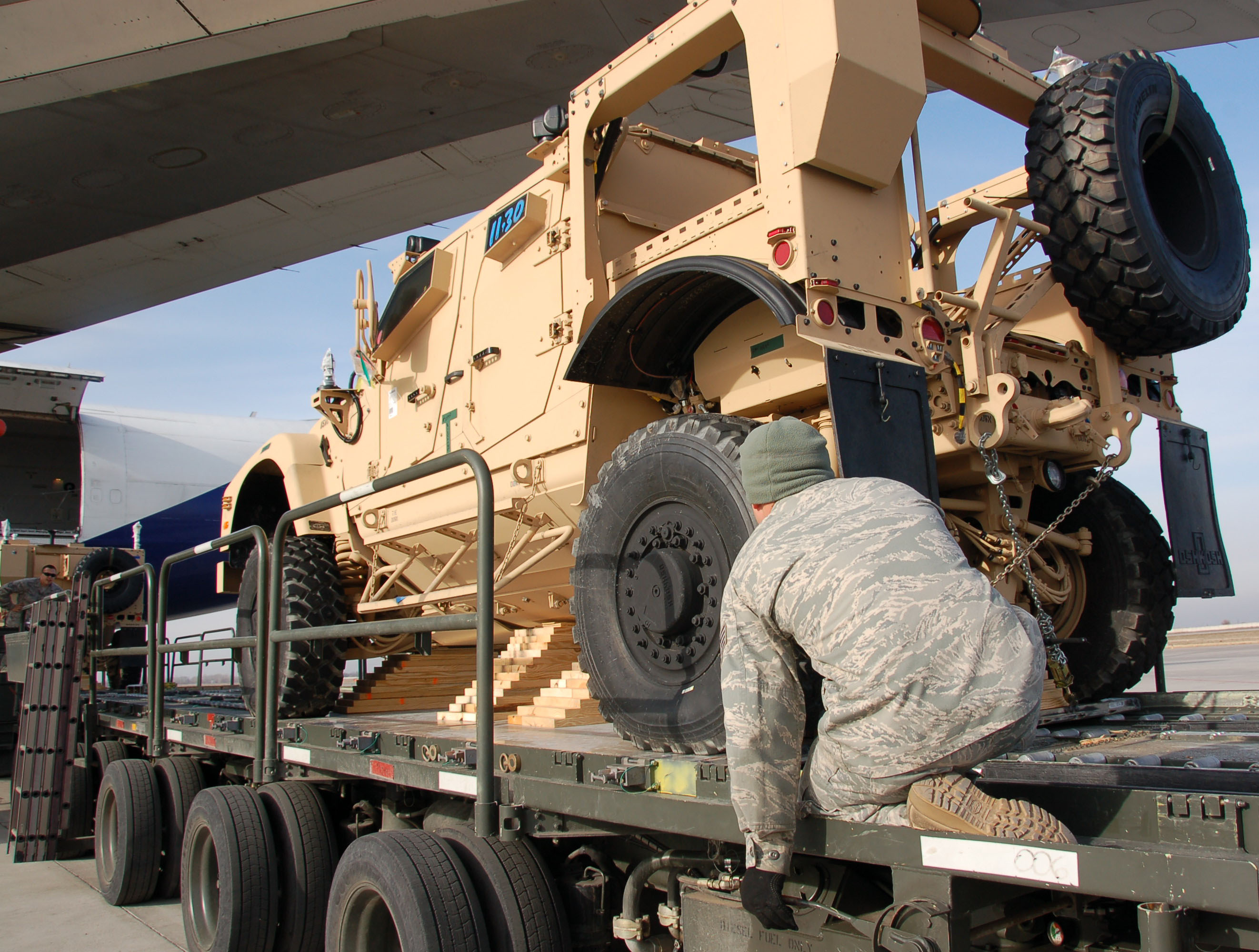 TRANSIT CENTER AT MANAS, Kyrgyzstan - A 376th Expeditionary Logistics Readiness Squadron Airman directs a new MRAP all-terrain vehicle off a commercial aircraft here Jan. 3. Several C-17s are staged here to provide airlift for military servicemembers and cargo. The new model is better suited for the current combat environment in Afghanistan. (U.S. Air Force photo by Tech. Sgt. Myco Apat)