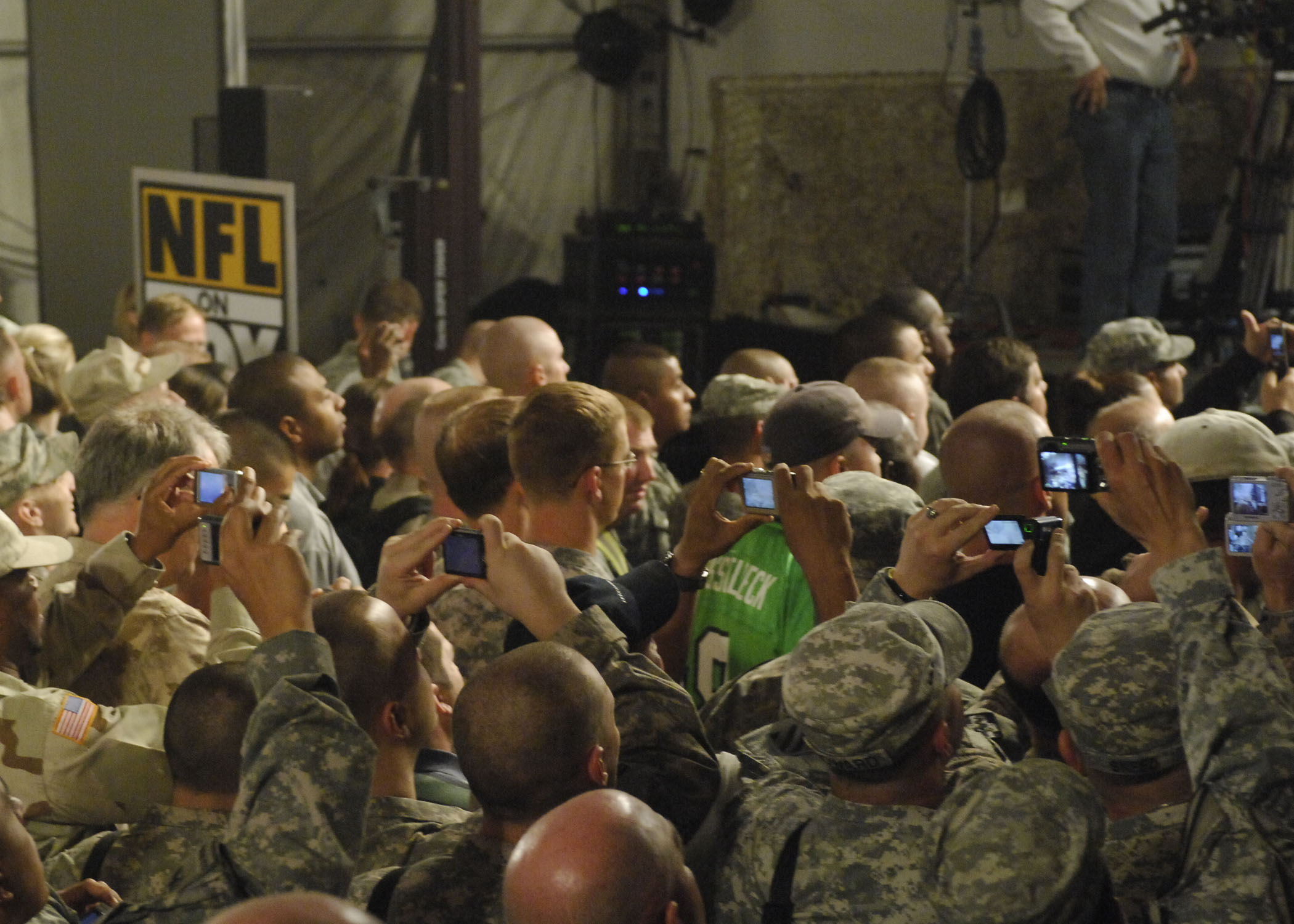 BAGRAM AIR FIELD, Afghanistan -- The crowd snaps photos during the "Fox NFL Sunday" pregame Nov. 7, 2009. Jay Glazer, Terry Bradshaw, Jimmy Johnson, Curt Menefee, Howie Long, and Michael Strahan came to visit Bagram to boost morale. The "Fox NFL Sunday" team is scheduled to broadcast live Nov. 8, 2009 from here. (U.S. Air Force photo/Senior Airman Felicia Juenke)