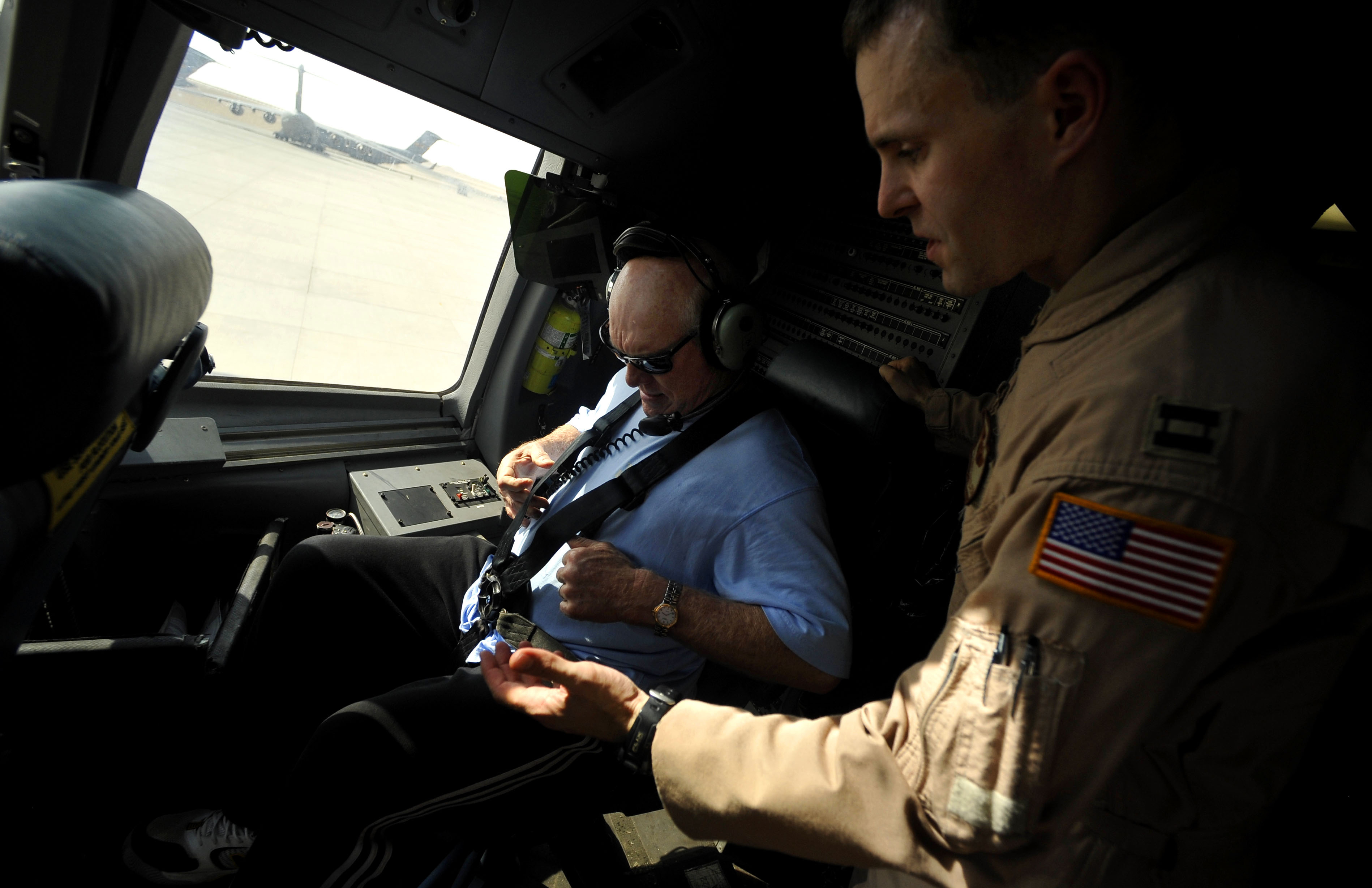 U.S. Air Force Capt. David Huffsteler, C-17 Globemaster III pilot, assigned to the 816th Expeditionary Airlift Squadron, deployed to Southwest Asia, assist Terry Bradshaw, former Quarterback with the Pittsburgh Steelers, with a co-pilot seatbelt on board a Charleston Air Force Base C-17, Nov. 5, 2009. Mr. Bradshaw will be in the cockpit during take- off of an air drop mission. (U.S. Air Force photo/Staff Sgt. Angelita Lawrence)