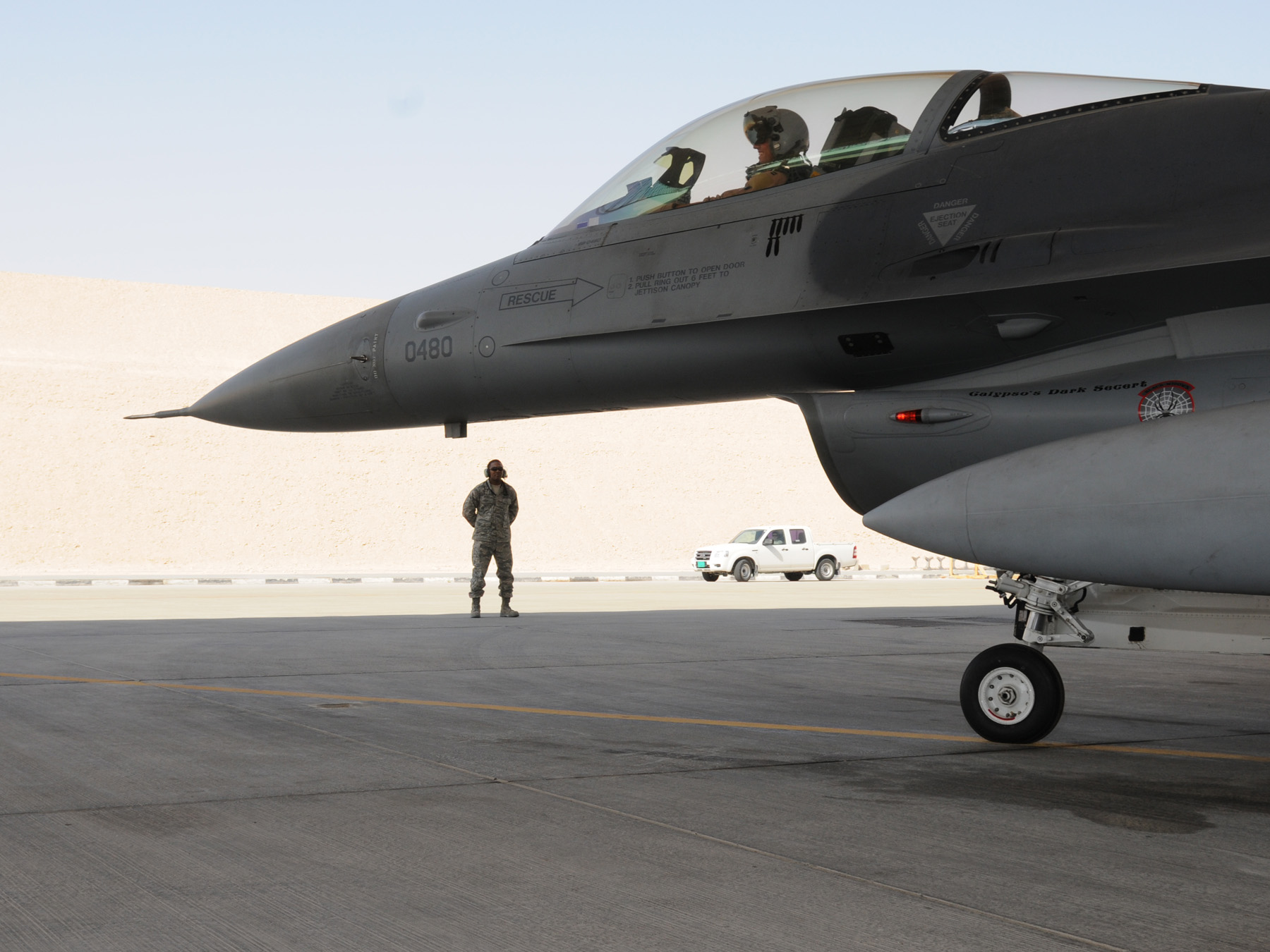 Maj. Michael Davis, 379th Expeditionary Maintenance Squadron operations officer, marshals an F-16 departing for a mission, Oct. 17, 2009. Major Davis worked on this particular aircraft as an Airman when he was an F-16 avionics system technician at Hill Air Force Base, Utah in 1989. This event serves as a representation of Major Davis's career progression from airman to major. Major Davis is deployed from Barksdale Air Force Base, La. in support of operations Iraqi Freedom and Enduring Freedom. (U.S. Air Force Photo/Tech. Sgt. Jason W. Edwards)