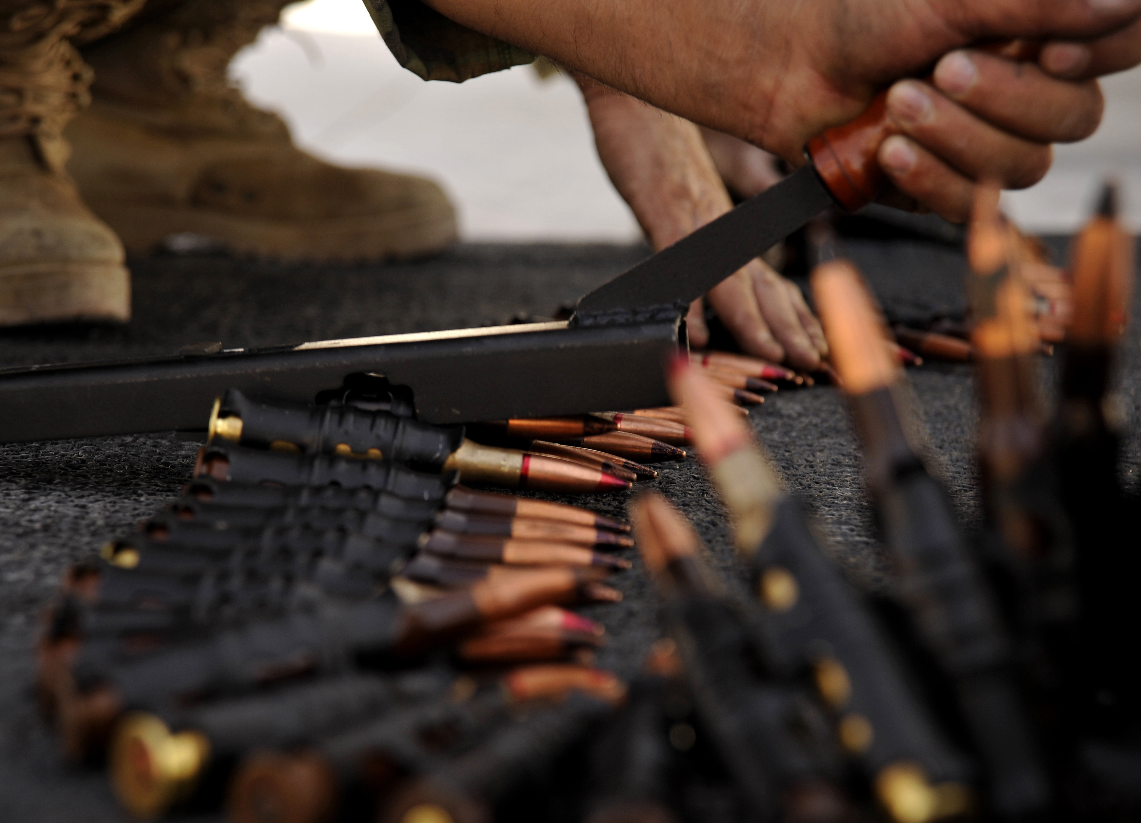 Airmen from the Afghan National Army Air Corps at Kandahar Air Field seat rounds prior to loading them in an Mi-35 Hind helicopter for a training mission over southern Afghanistan Oct. 3, 2009. U.S. Air Force Airmen from the 438th Air Expeditionary Training Group and coalition partners are supporting the Afghans as they work to establish their independent air force. (U.S. Air Force photo/Staff Sgt. Angelita Lawrence)