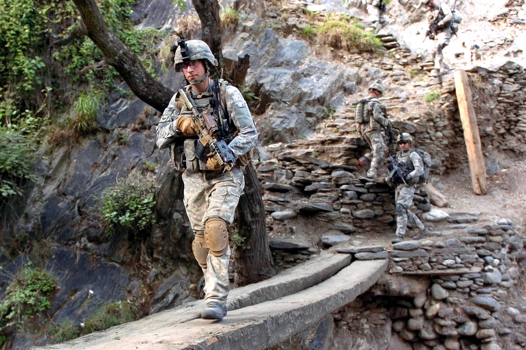 KUNAR PROVINCE -- Airman 1st Class James Craddick, a Joint Expeditionary Tasked Airman, crosses a fast-flowing river while on patrol in Korengal Valley, Kunar province, Afghanistan, Oct. 1, 2009. Airman Craddick is assigned to 4th Infantry Division's Company B, 2nd Battalion, 12th Infantry Regiment. (U.S. Army photo/Sgt. Matthew Moeller)