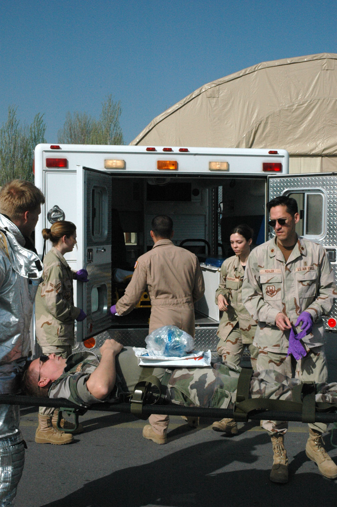 Dr. (Maj.) Daren Mealer gloves up in order to treat incoming patients during a base exercise held at April 14 Manas Air Base, Kyrgyzstan. Doctor Mealer is deployed from the 10th Medical Operations Squadron, USAF Academy, Colorado Springs, Colo. (Air Force Photo/Master Sgt. Daniel Nathaniel)