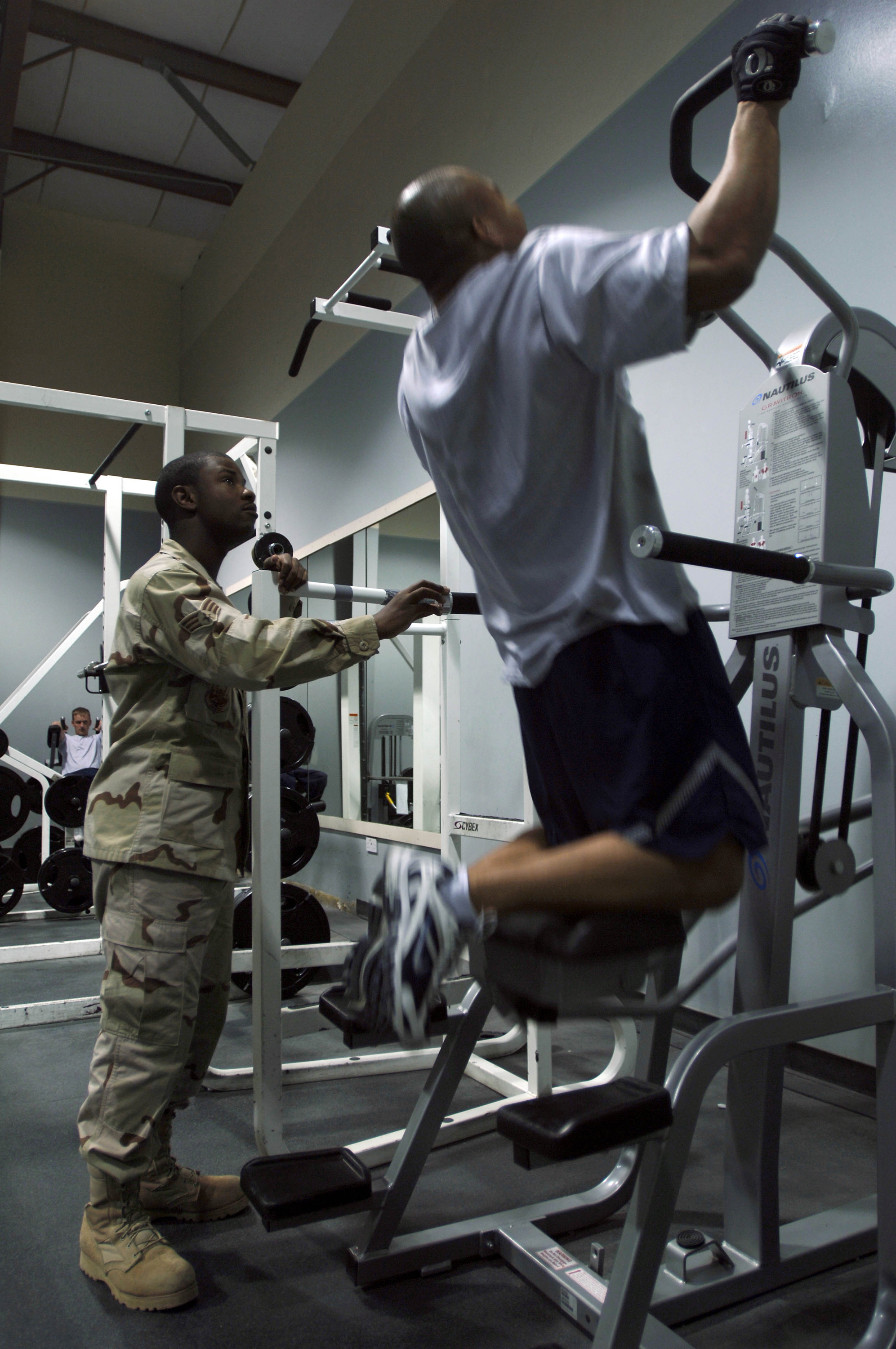 SrA Joshua N. Collins from the 386 Expeditionary Services Squadron (386 ESVS), assists spots an Air Force member on the pull up machine last Monday, 9 April 2007 at an undisclosed location in Southwest Asia. With fitness becoming a more important part of Air Force life the 386 ESVS fitness center personnel have their hands full training and observing the fitness programs of Air Force members. (U.S. Air Force photo by Tech. Sgt. Edward D. Holzapfel) (Released)