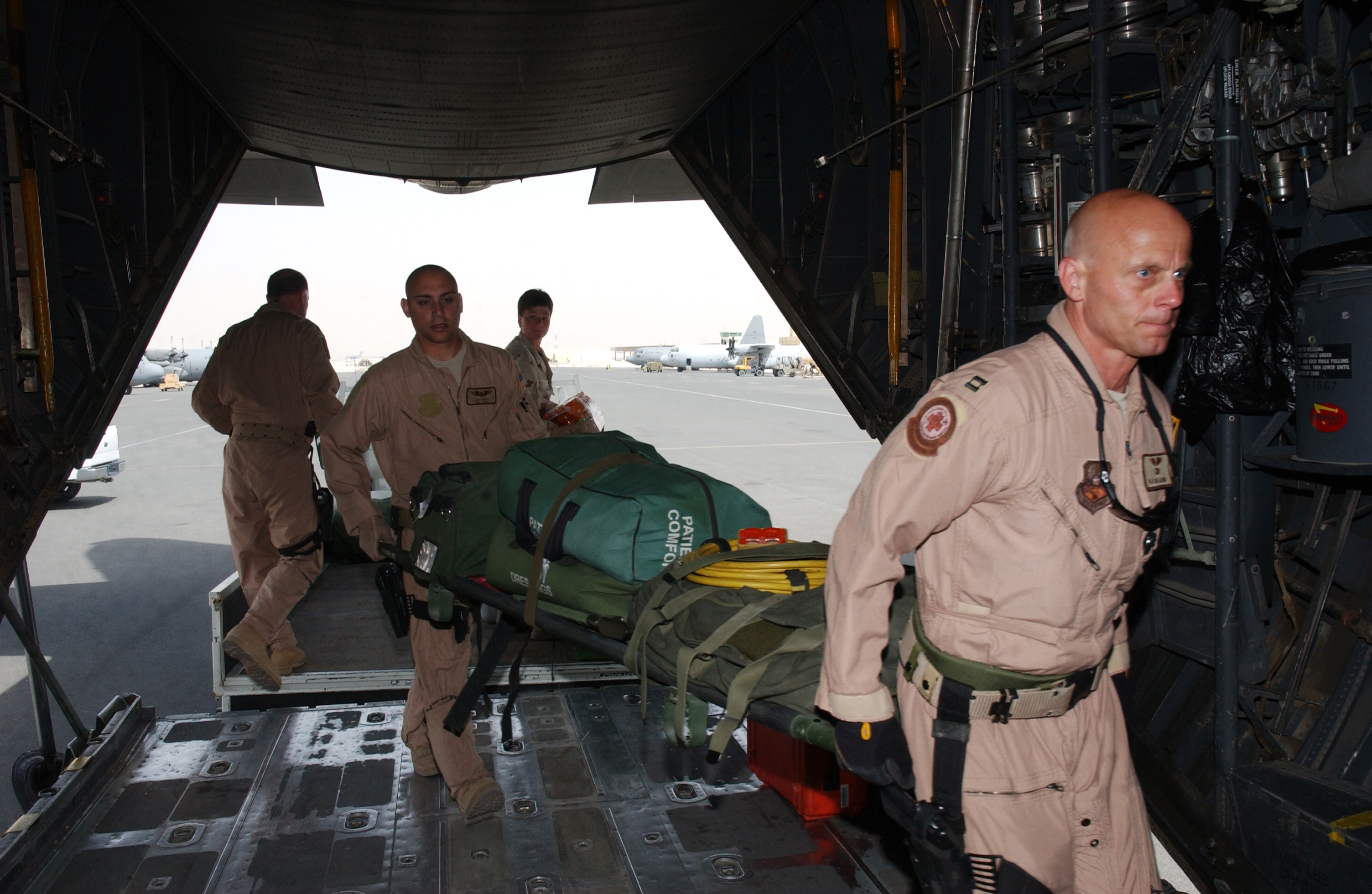 Capt. Ben Meadows (right), 379th Expeditionary Aeromedical Evacuation Squadron flight nurse, and Senior Airman Josh Green, 379th EAES technician, load up a C-130 Hercules with medical supplies and equipment in preparation for a mission in Southwest Asia. The Air National Guardsmen are part of a Total Force team comprised of active duty, Reserve and Air National Guard personnel. About 90 percent of Air Force aeromedical evacuation personnel and assets are from the Reserve components. (Photo by Tech. Sgt. Deborah Davis)