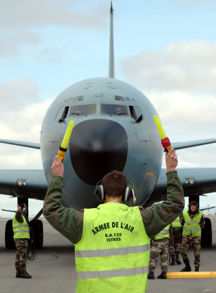 French coalition ‘Les Pistards’ or ground crew marshall in a C-135FR refueler at Manas Air Base, Kyrgyzstan. (Air Force photo/Master Sgt. Daniel Nathaniel)