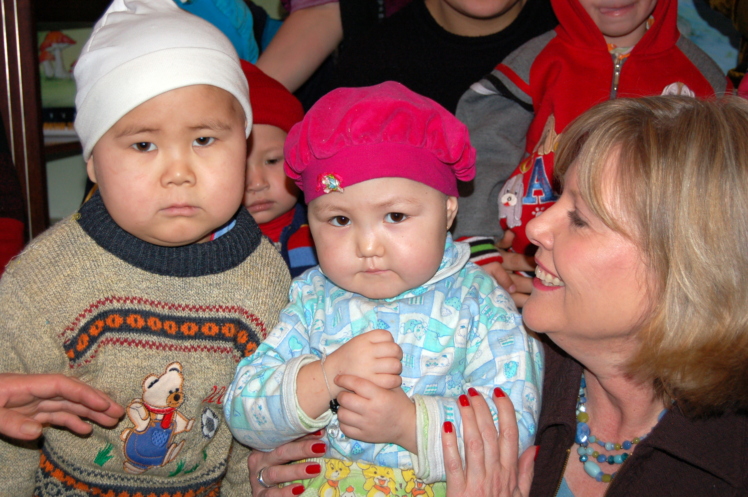 Mrs. Suzie Schwartz, wife of Gen. Norton Schwartz, U.S. Transportation Command commander, spends time with patients from the Children’s Cancer Center Wednesday March 14. Mrs. Schwartz took part in the Manas Air Base Outreach Society trip while General Schwartz was here for high-level discussions on regional security and promoting further cooperation between the United States and the Kyrgyz Republic to help bring peace and prosperity to Afghanistan. (U.S. Air Force Photo/Senior Master Sgt. Timothy Cook)
