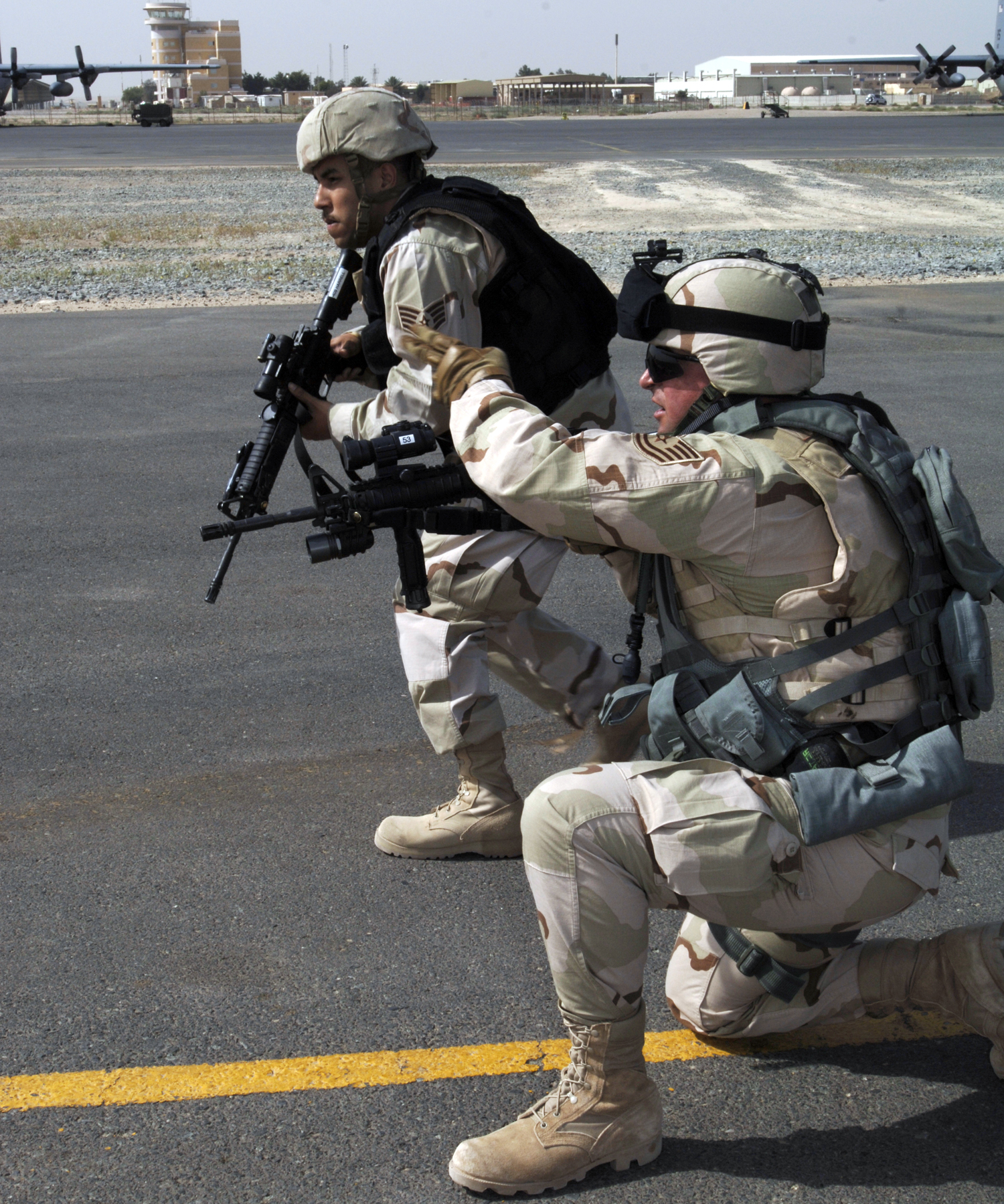 SSgt Jonathan Darkentell and TSgt Richard I Putman, from the 386th Expeditionary Security Forces Squadron, practice Fly Away Security Team (FAST) tactics at an undisclosed location in Southwest Asia on Saturday, January 10, 2007. (U.S. Air Force photo by Tech. Sgt. Edward D. Holzapfel) (Released)