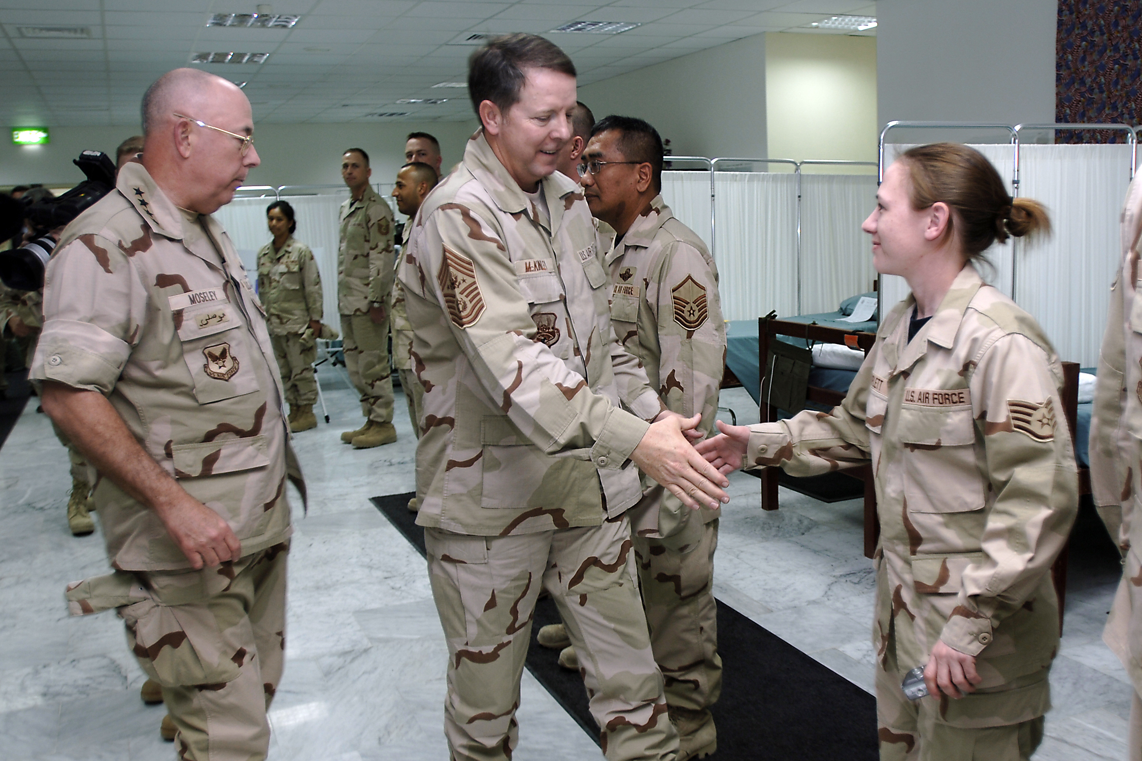 SOUTHWEST ASIA -- Air Force Chief of Staff, General T. Michael Moseley and Chief Master Sergeant of the Air Force Rodney J. McKinley, meet and greet troops from the 386 Contingency Aeromedical Staging Facility (CASF), at an undisclosed location in Southwest Asia last Saturday on a trip to get his message out to 386 Air Expeditionary Wing Airmen. USAF Photo by TSgt Edward D. Holzapfel (RELEASED)