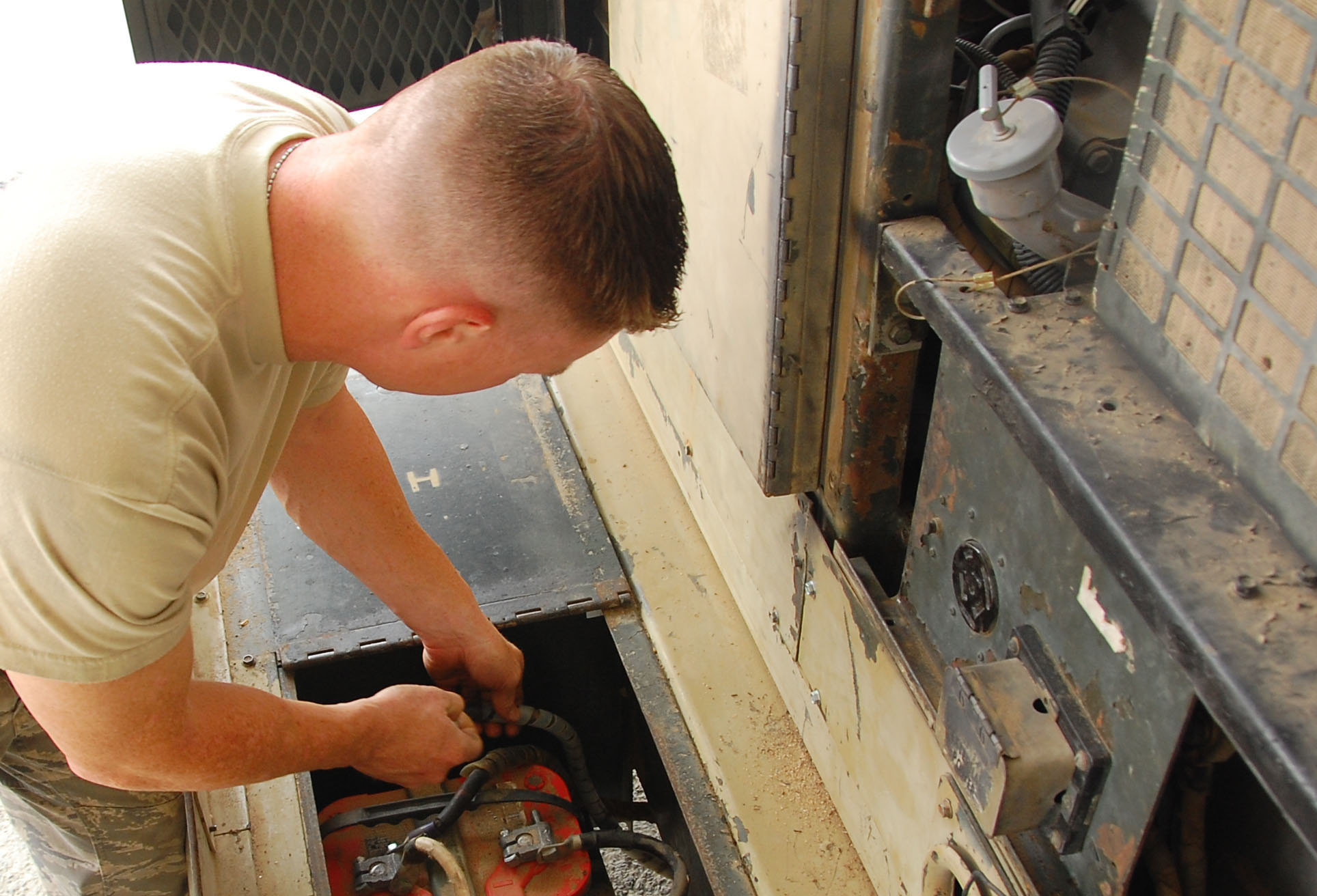SOUTHWEST ASIA -- Tech. Sgt. Jeff Hargis, 386th Aerospace Ground Equipment Flight member, disconnects the battery terminals on a diesel generator prior to electrical maintenance. The generators supply power to aircraft on the flightline. Sergeant Hargis is deployed from Davis Monthan Air Force Base, Ariz.(U.S. Air Force photo/Staff Sgt. Shaun Emery)